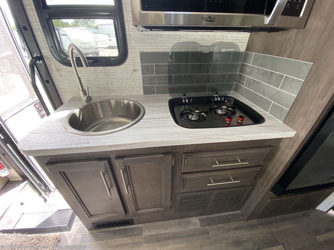 Head across the states in this comfortable coach that can sleep five each night. You will enjoy an RV queen bed just like you have at home, and your guests can sleep on the U-shaped dinette and cab-over bunk. If you're not needing the overhead bunk, just choose the optional front entertainment center with a 32" LED HDTV, and the dinette can also be optioned out for theater seating to make this a couples coach. You can prepare all your meals on the Suburban two burner drop-in cooktop, or use the convection microwave. The flip-up counter will provide more counter space, and all your perishables can be stored in the 10 cu. ft. 12V refrigerator.