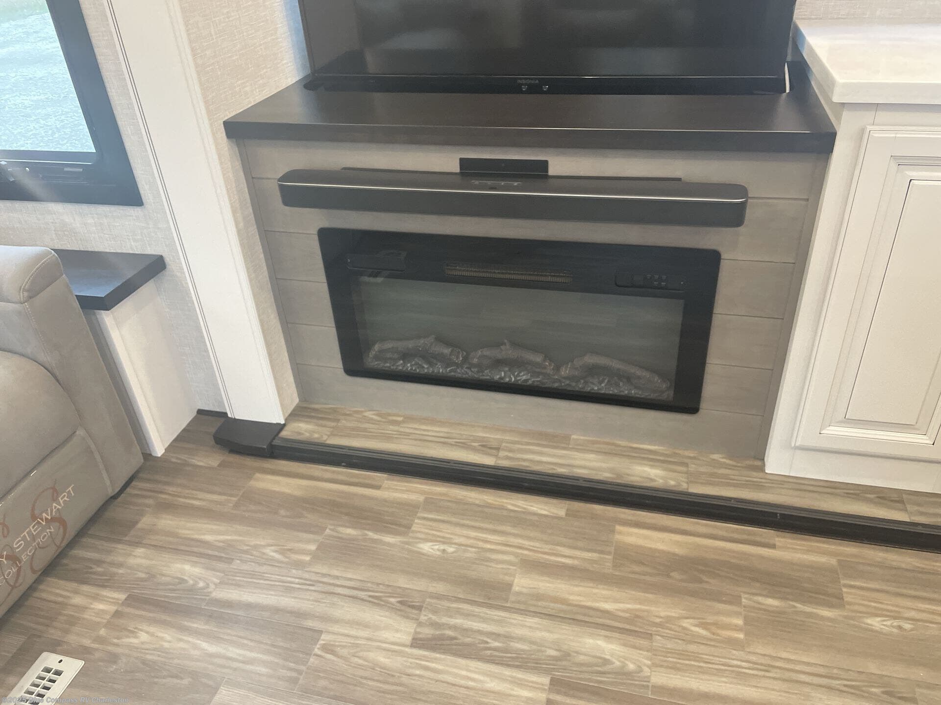 Whether you want to live in this fifth wheel or travel for long periods at a time, you will enjoy the spacious main living and kitchen area with dual slide outs as well as the bedroom with a slide out king bed. You will also find a walk-in closet with hamper and prepped space for a washer/dryer option, and a flip-top dresser with 32" TV. Easily get cleaned up in the full bathroom which also has linen storage. The cook will have a residential refrigerator to store all the cold items and beverages, a kitchen island, a pantry and a residential 24" stove. The 50" Smart LED HDTV with fully digital HDMI output and home entertainment system with subwoofer and fireplace below will provide a cozy place to watch your shows while relaxing on the theater seats, the tri-fold sofa, or the free standing table with leaf, two free-standing chairs, and two folding chairs.