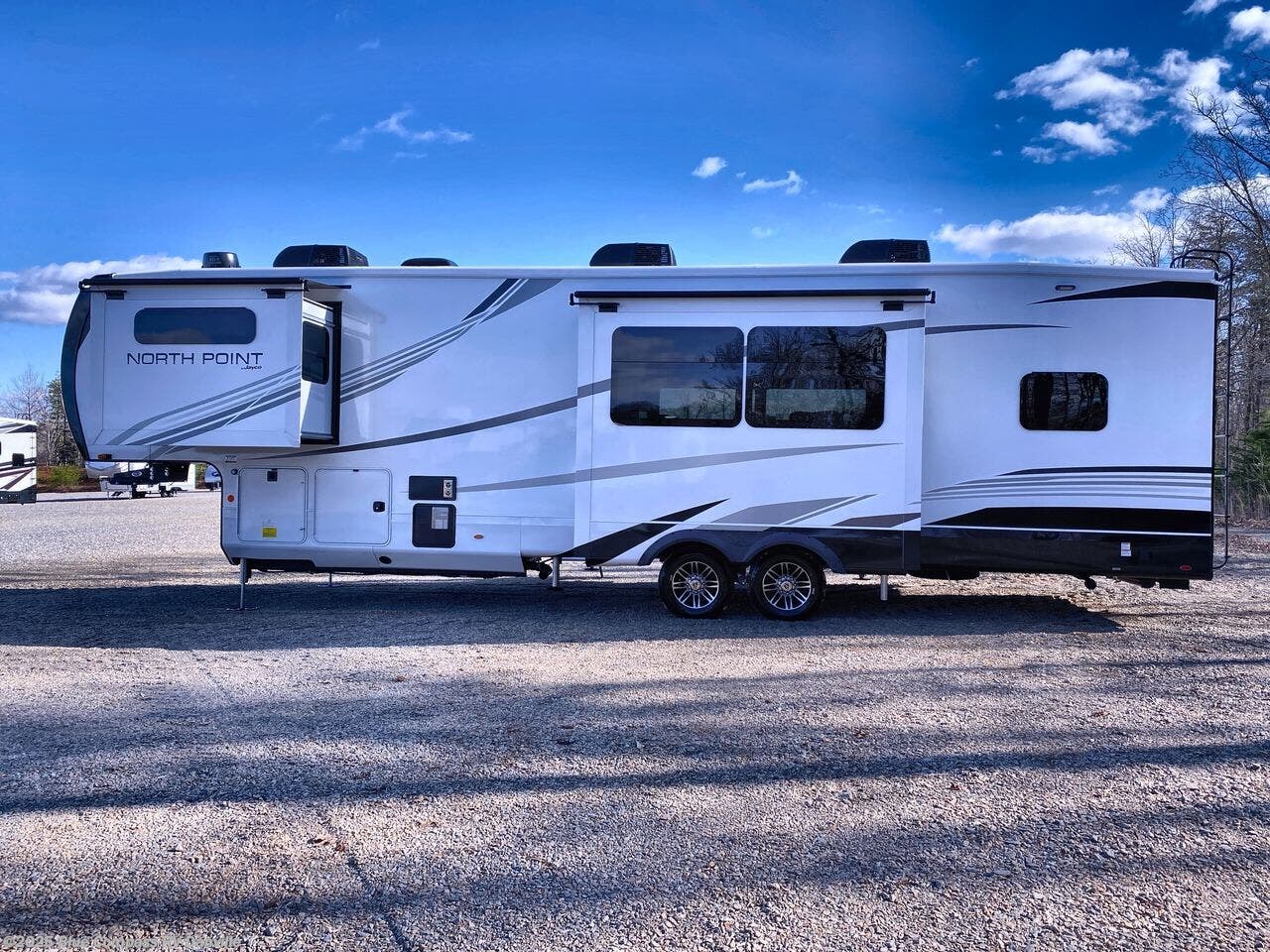 With any North Point fifth wheel by Jayco you begin with a strong foundation with a custom frame, designed and sized specifically to best support each unit. Constructed with Stronghold VBL™ aluminum framed, vacuum bond laminated walls and the Magnum Truss™ XL6™ roof system with a one-piece, seamless roof material which is the strongest tested roof in the industry. The 5-Star Handling package is included with Uniroyal tires, a MORryde rubber pin box, Dexter axles with Nev-R-Adjust brakes, MORryde CRE-3000 rubberized suspension and wet bolt fasteners and bronze bushings. The interior has handcrafted hardwood glazed doors and drawers, vinyl flooring throughout, a vessel bowl sink with high rise faucet in the main bathroom, plus so much more you just have to see one to believe it all!