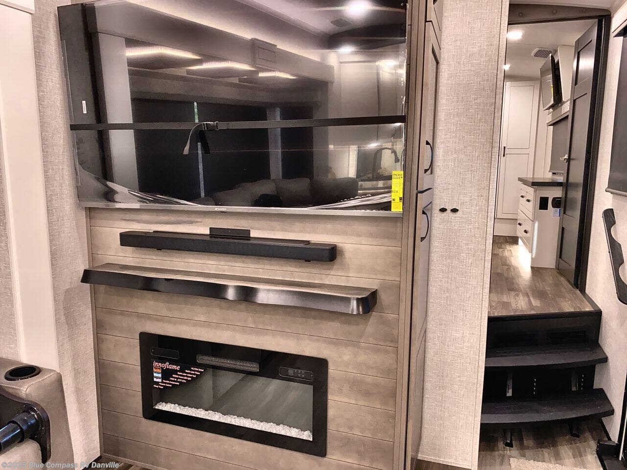 Convenience, comfort, and style are found throughout this fifth wheel and a cook might call this a dream kitchen in the rear that includes two slide outs for maximum space, residential appliances including a 21 cu. ft. residential refrigerator, a double pull-out extension with two chairs and a breakfast bar top with two more chairs allowing you to look into the middle living area. Here you will find two tri-fold sofa slides and theater seats, a ceiling fan to keep the air flowing, and a 50" Smart LED HDTV with fully digital HDMI output and home entertainment system with subwoofer. The fireplace makes the room cozy, the shoe storage under the interior steps is convenient, and the entry is a few steps away for you to be able to go outside to relax under the two awnings. When you are ready to retire for the evening, get cleaned up in the full bathroom and fall quickly to sleep on your own king bed slide after grabbing your pajamas from the flip-top dresser or the walk-in closet which also includes a hamper and a washer/dryer prepped space to add that option.