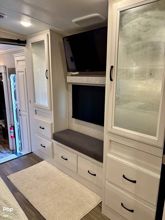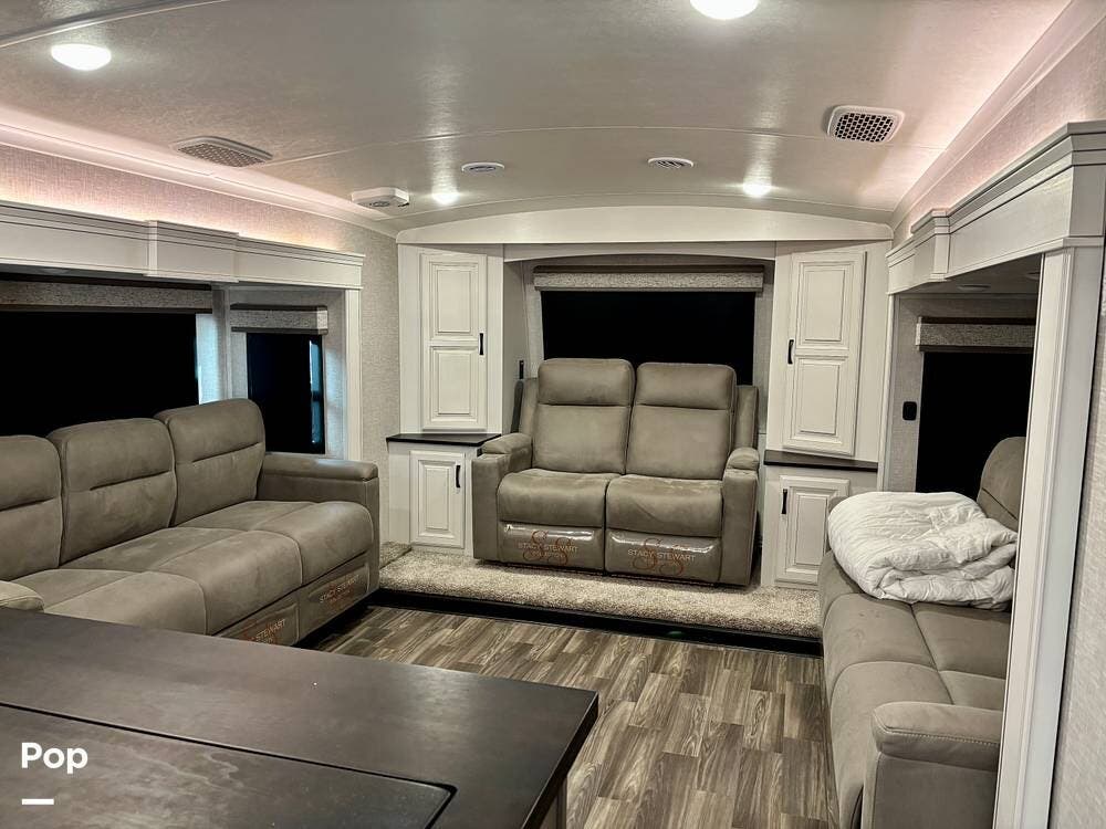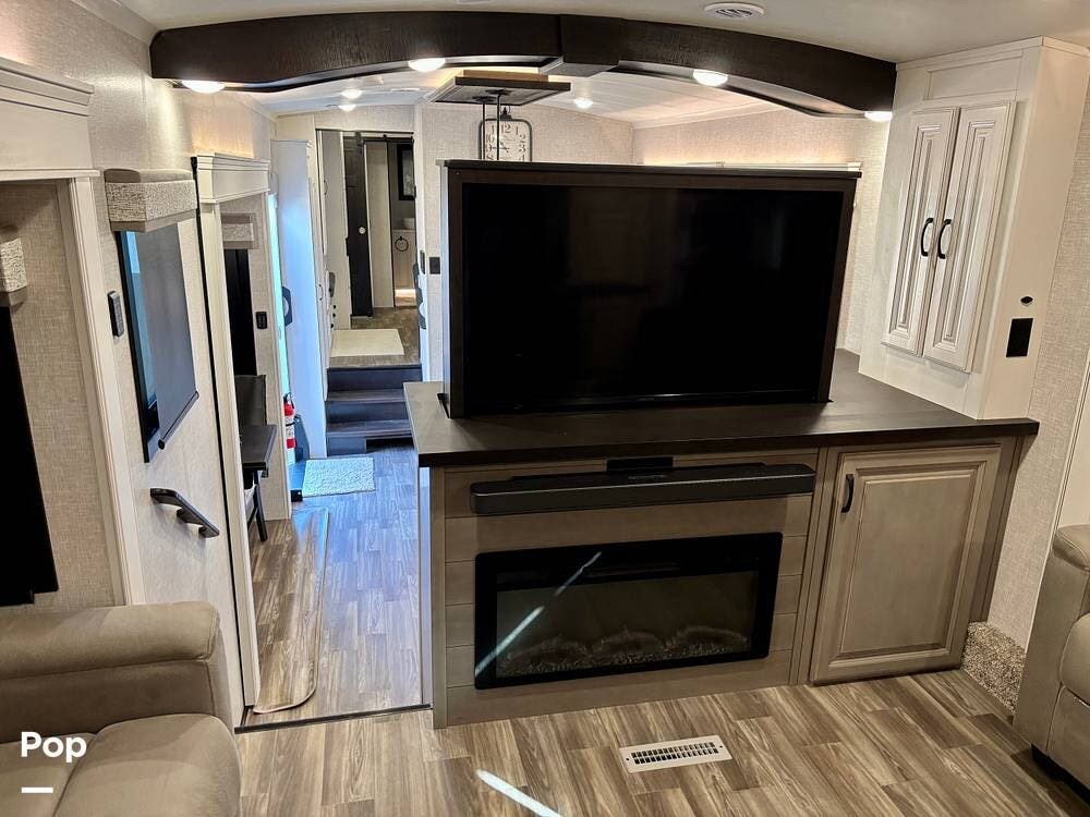 This One Owner 2024 North Point 382FLRB by Jayco is a fifth wheel designed to make every destination feel like a luxury retreat. With five slide outs, the interior opens wide to create an impressive sense of space, giving you room to relax, entertain, and truly settle in wherever the road takes you. From the moment you step inside, the front living area draws you in with comfortable seating, including a theater recliner, sofas, and a tri-fold sofa, all centered around a cozy fireplace and multiple TVs that make evenings inside just as enjoyable as time spent outdoors.