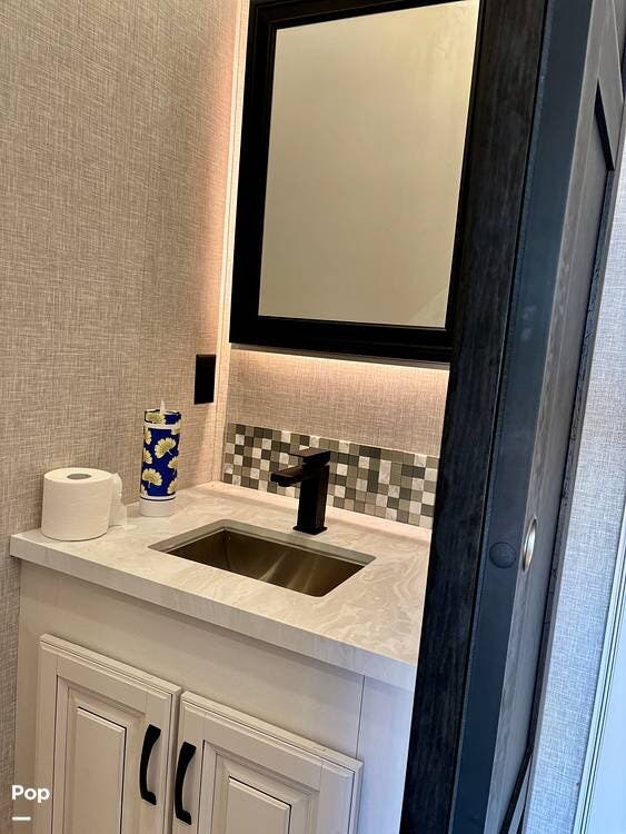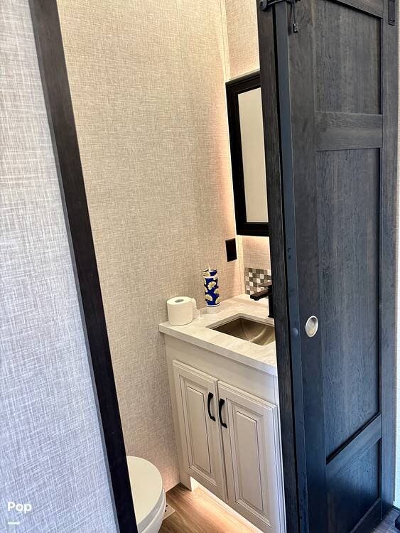 Privacy and functionality are thoughtfully designed into the layout with a convenient half bath for guests and a spacious main bathroom that feels residential. Dual sinks, ample storage, and a well-planned layout make mornings easy and evenings relaxing. The king bed in the bedroom provides a true place to rest, creating a calm, comfortable retreat at the end of the day.