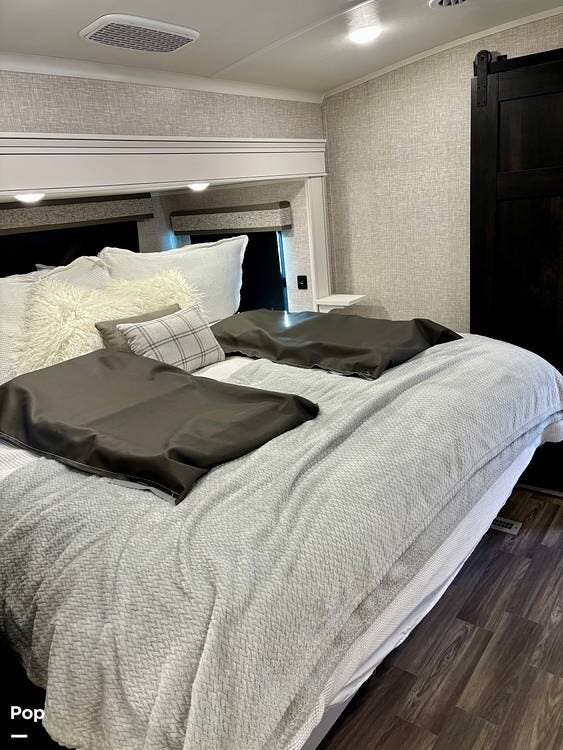 The kitchen is built for real living, not just weekend trips. A large island anchors the space, offering generous counter space and storage, while the pantry keeps everything organized for extended stays. Cooking, dining, and gathering feel effortless, whether you're hosting friends or enjoying a quiet night in. The washer and dryer combo adds everyday convenience, allowing you to travel longer without sacrificing comfort.