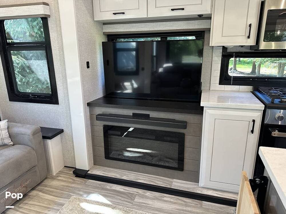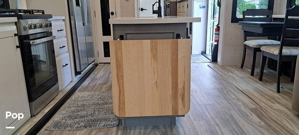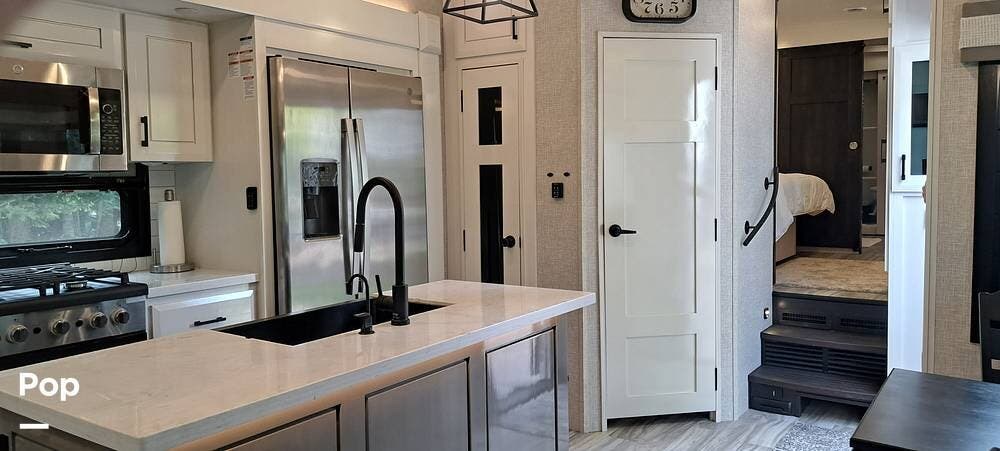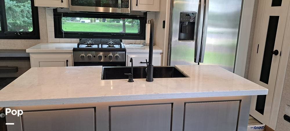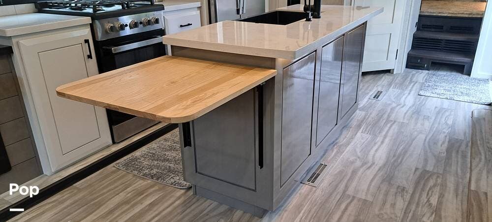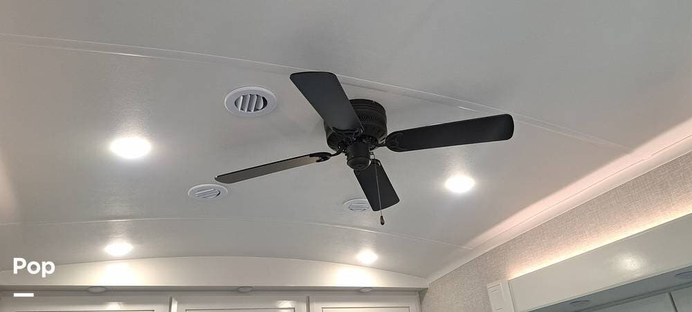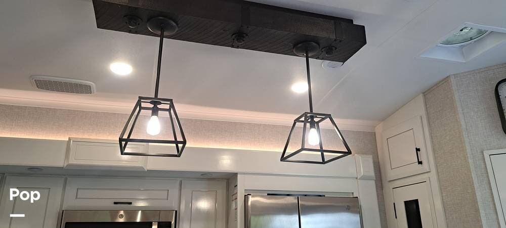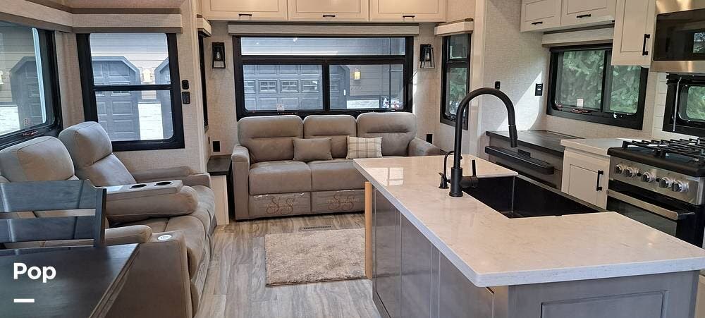 Inside, you will find a large living area thanks to a double slide that sports a kitchen island with drop-down lighting and an overhead fan.