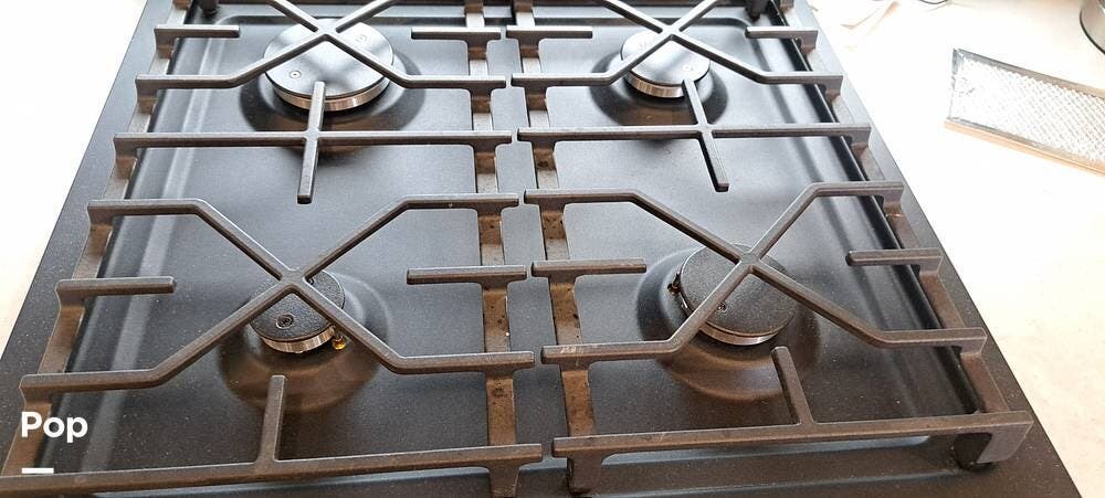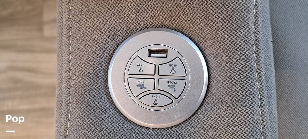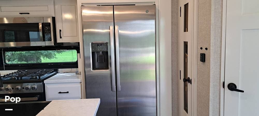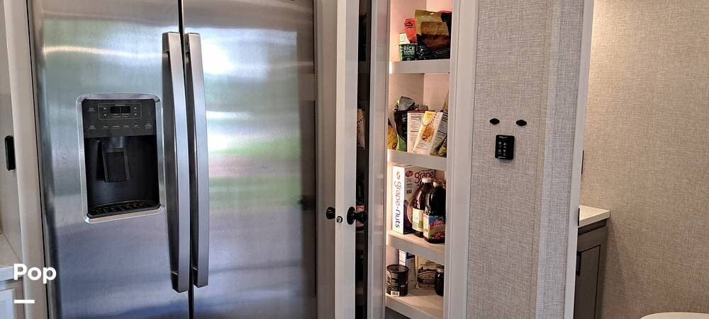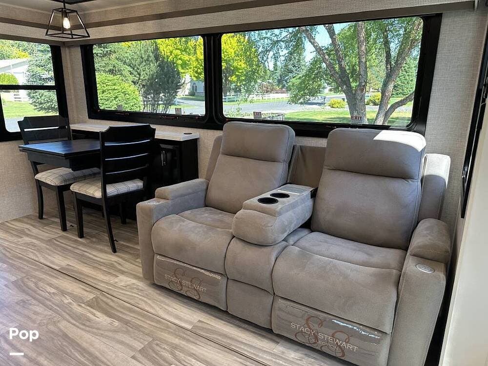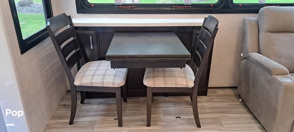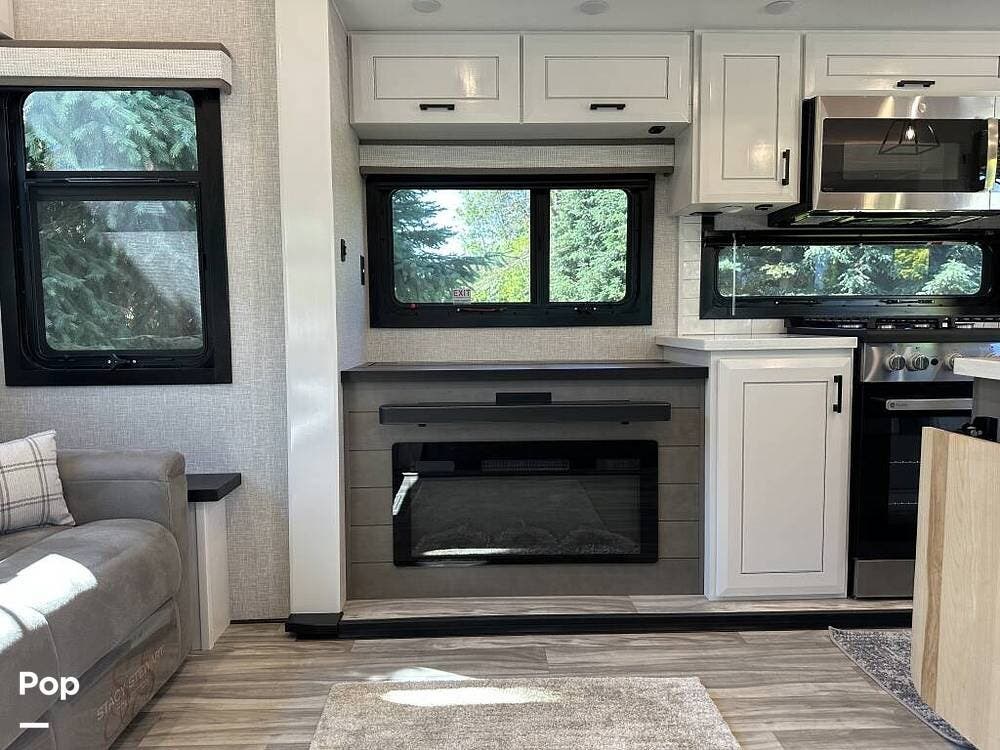 Inside, you will find a large living area thanks to a double slide that sports a kitchen island with drop-down lighting and an overhead fan.