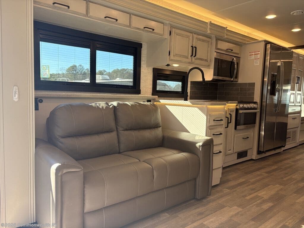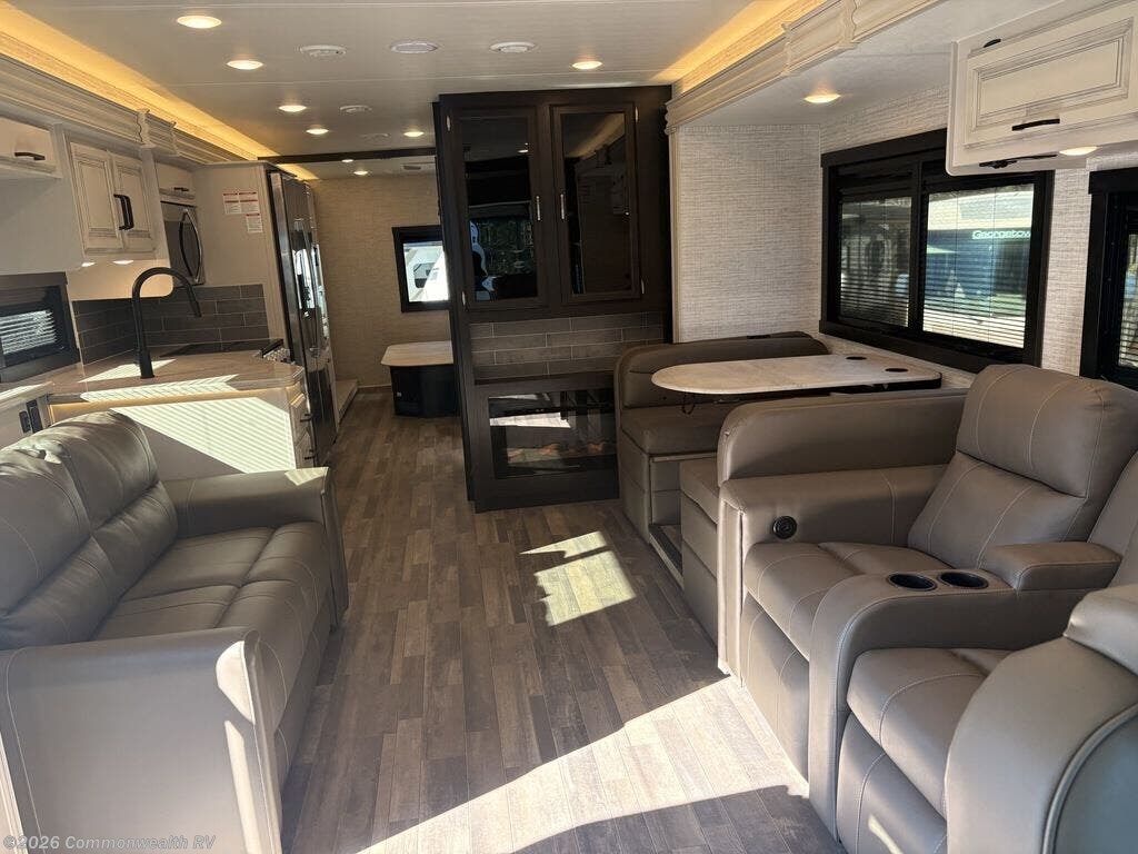 2024 Jayco Precept 34G Class A motorhome featuring a modern, open interior with a residential-style kitchen, spacious living area, and walk-around king bed. Ideal for road trips and extended stays, it offers updated décor, smart coach controls, generous storage, and a comfortable, home-like feel throughout!
