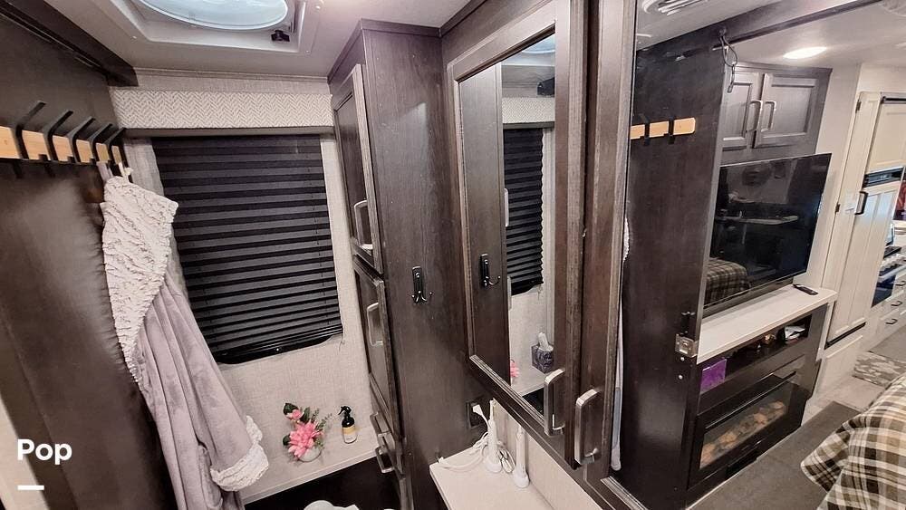 The private rear bedroom offers a queen-size Murphy bed with storage, wardrobe, and TV hookup, while the full bath gives you all the comforts of home with a roomy shower and vanity. Outside, enjoy the power awning with LED lighting, exterior storage compartments, and an outdoor entertainment system -- ideal for evenings under the stars.