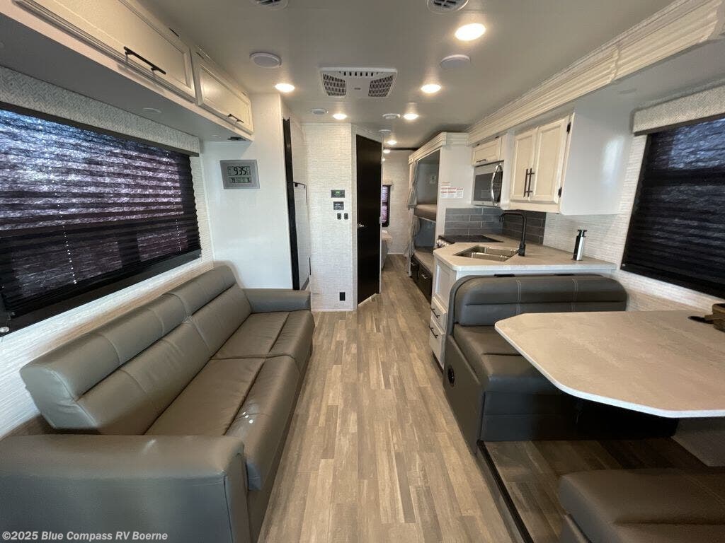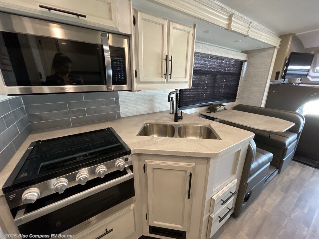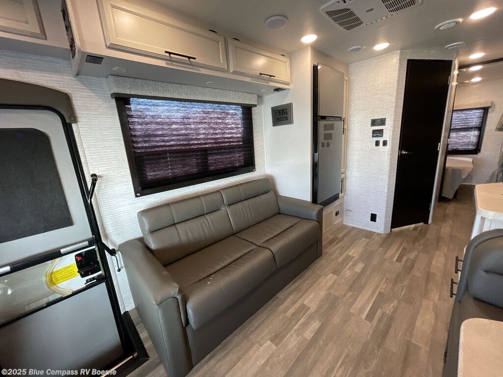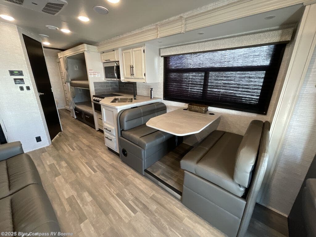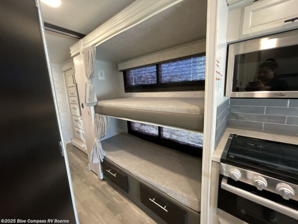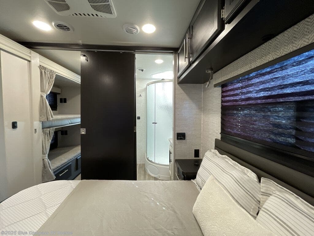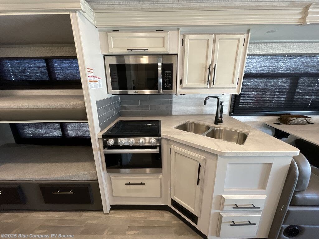 Searching for an RV to travel with family and friends? This coach offers up to seven sleeping spaces when you utilize the queen bed, the bunk beds, the cab over bunk and the furniture. The private master bedroom is in the rear and has access to the double entry bathroom, and the bunk beds are just across from the main entrance which is convenient. The kitchen provides a Furrion all-in-one cooktop and oven, a residential-size microwave and an 10 cu. ft. refrigerator, plus a pantry. You can dine at the Jayco exclusive, easy-operation legless dinette table or while sitting on the sofa. You might like to add the theater seating option in place of the sofa if you prefer that setup. And the cab seats swivel for more seating.
