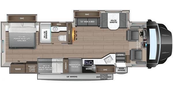 Fireplace, big screen TV, and all the options transform this coach into a rolling Home.