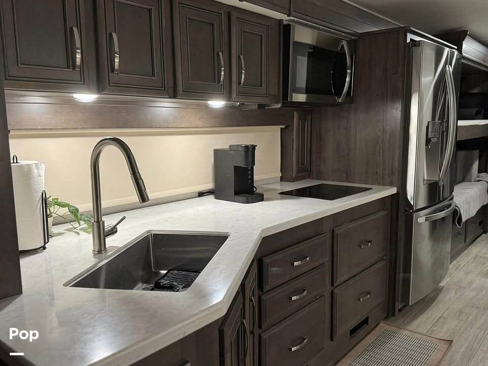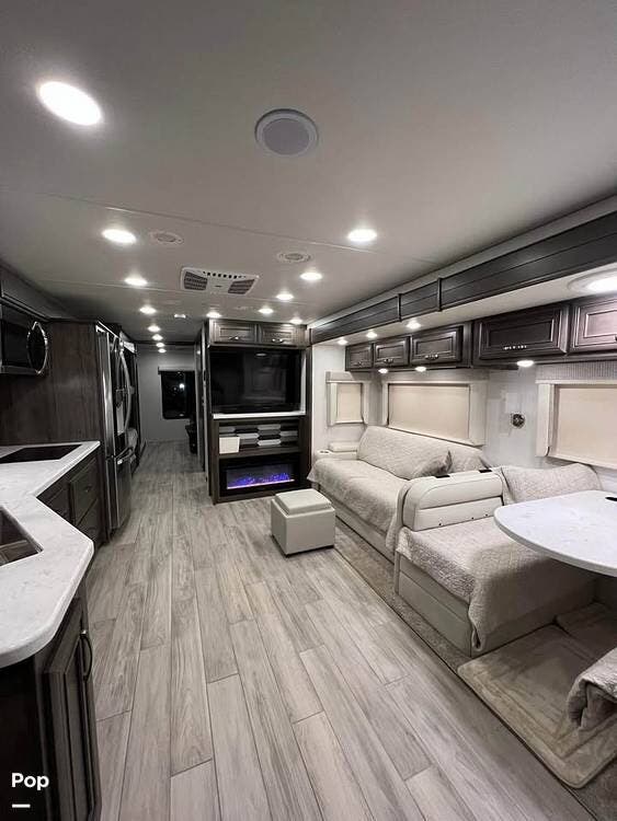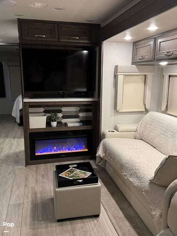Inside, you'll find a beautifully appointed interior featuring premium hardwood cabinetry, solid-surface countertops, and high-end furnishings. The living area includes theater seating, a convertible booth dinette, and an entertainment center with a large LED TV and cozy fireplace -- perfect for relaxing after a day of travel.