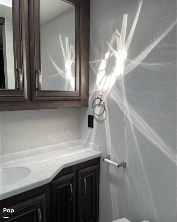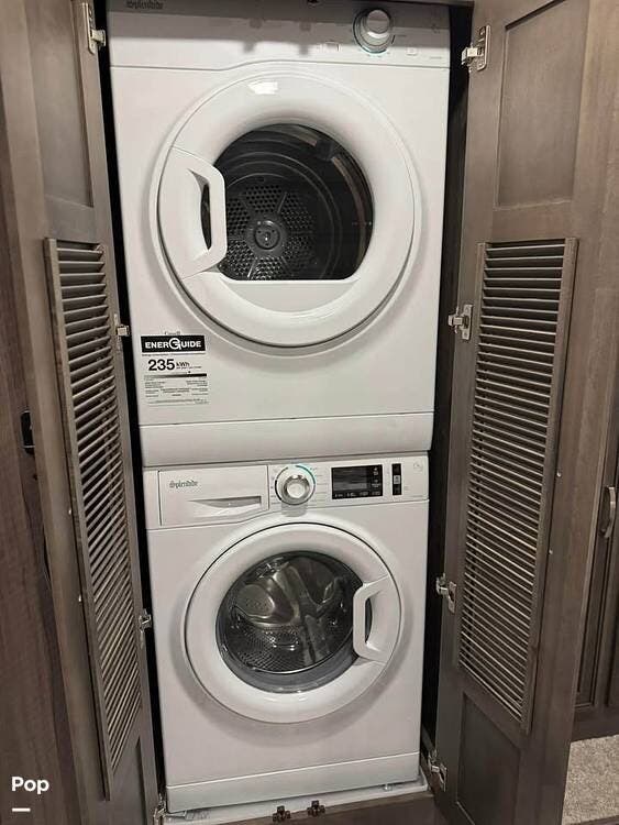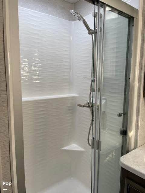 This model's spacious design also includes a bath-and-a-half layout, ideal for families or guests. The rear master suite offers a king-size bed, wardrobe storage, and its own entertainment system, while the full rear bath features a large shower, vanity, and washer/dryer prep. Up front, the cab-over bunk adds even more sleeping flexibility without sacrificing headroom or style.