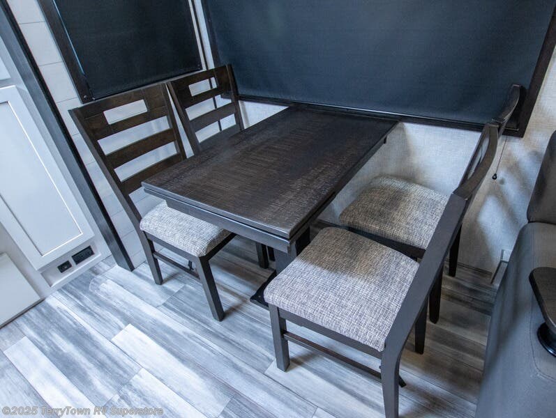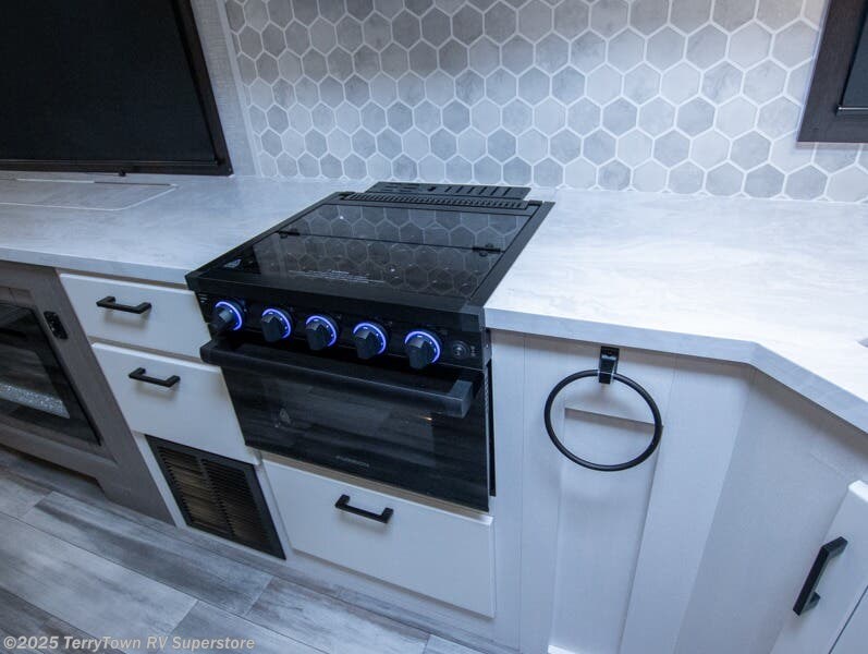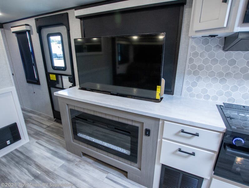 Step inside this rear kitchen travel trailer for fun family vacations. The large slide will provide the chef space to cook, while the kids watch a movie on the Smart LED TV. If the weather is just right, you will probably want to cook on the outside kitchen while the kids ride their bikes around the campsite. This model includes a tri-fold sofa and a booth dinette that will be perfect for meal times, relaxing, and sleeping space at night. You and your spouse can take the front private bedroom with a queen bed and dual wardrobes for your things, and the full bath is centrally located for easy access!