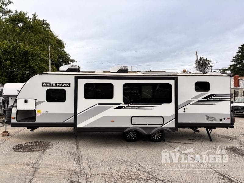 The lightweight White Hawk travel trailers by Jayco will blow you away with their roomy interiors, luxurious amenities, and durable construction. The Magnum Truss Roof System can withstand 50% more weight than the competition, and the Stronghold VBL lamination is the lightest, yet strongest in the industry. Each model includes American-made Goodyear tires with self-adjusting brakes, dark tinted, frameless safety glass windows, and modern graphics package with dual-colored sidewalls for a sleek look. The White Hawk travel trailers also include a barreled interior ceiling with up to 81" of interior height, an electric fireplace, decorative kitchen backsplash, plus many more interior comforts!