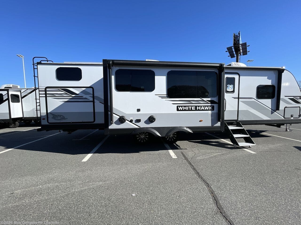 The lightweight White Hawk travel trailers by Jayco will blow you away with their roomy interiors, luxurious amenities, and durable construction. The Magnum Truss Roof System can withstand 50% more weight than the competition, and the Stronghold VBL lamination is the lightest, yet strongest in the industry. Each model includes American-made Goodyear tires with self-adjusting brakes, dark tinted, frameless safety glass windows, and modern graphics package with dual-colored sidewalls for a sleek look. The White Hawk travel trailers also include a barreled interior ceiling with up to 81" of interior height, an electric fireplace, decorative kitchen backsplash, plus many more interior comforts!