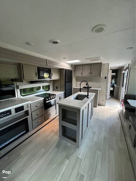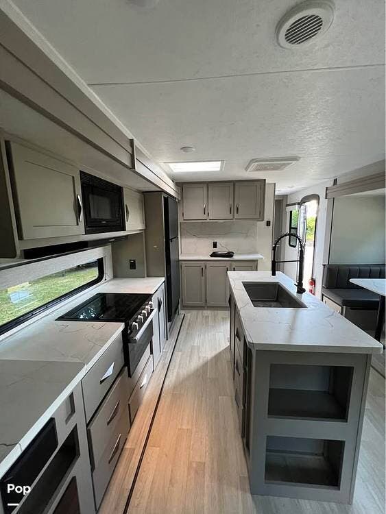It features a large kitchen with a 3-burner stove/oven, full-size refrigerator, microwave, generous counter space, including a pantry, and a kitchen island with an extra-deep sink, making meal preparation convenient and enjoyable.