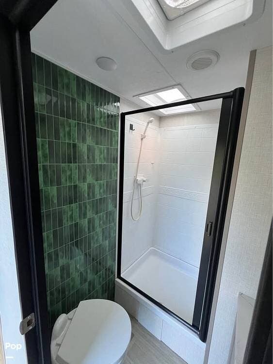 Additional highlights include a roomy bathroom with a large shower, quality cabinetry, and the climate package for four-season use. The seller is including custom-fit skirting for additional protection in the cold. It has a quick twist lock system.