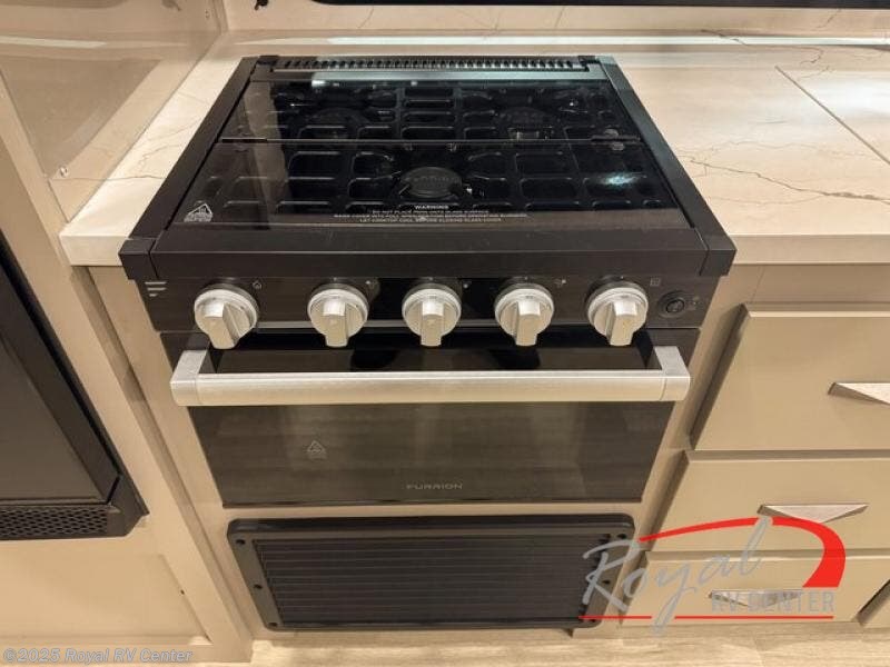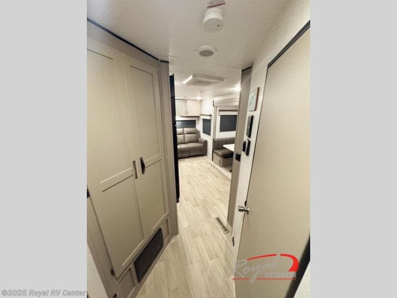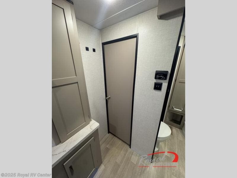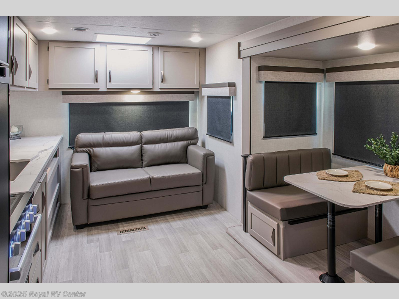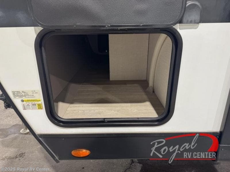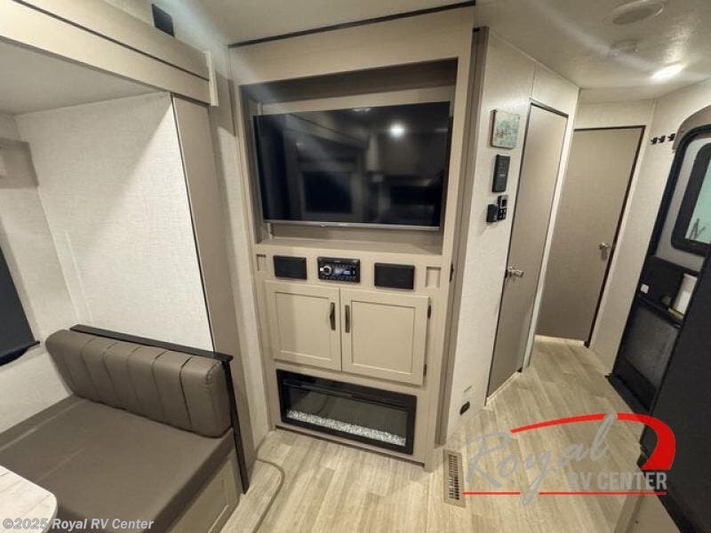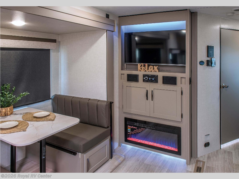 This is the perfect couple's travel trailer! You will enjoy added space in the living area because of the single slide that holds the booth dinette or optional table and chairs, and another convenient feature is the dual-entry bathroom that can be accessed from the main hallway or the bedroom. You will be quite surprised to find a king-size bed slide inside the bedroom, but you will be immensely happy that it's there come bedtime. A pass-through storage on the exterior allows you to bring along extra gear, and the interior is kept cozy on chilly fall evenings with the 30" fireplace. There is even an outside kitchen to grill up the catch of the day outdoors!