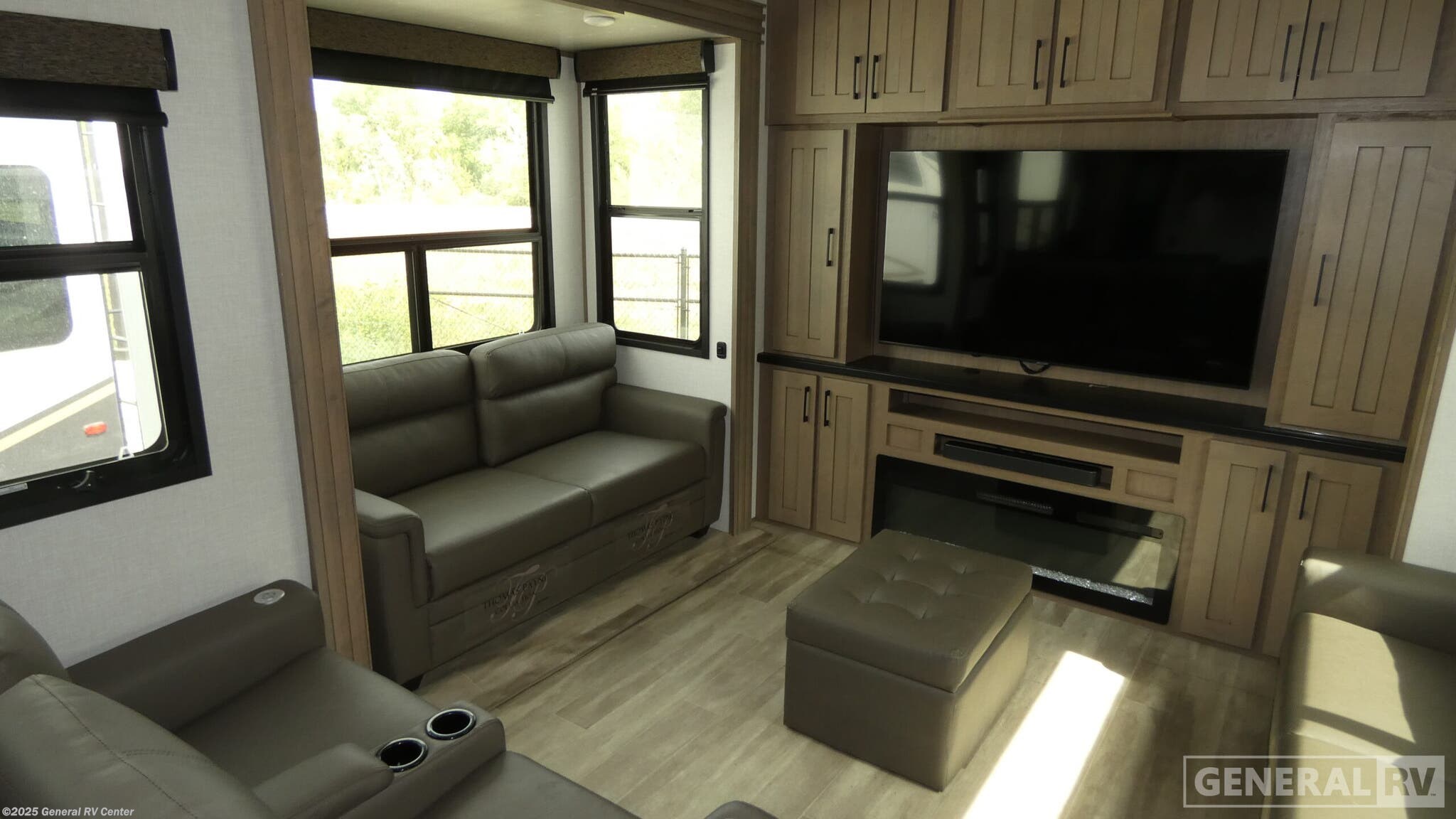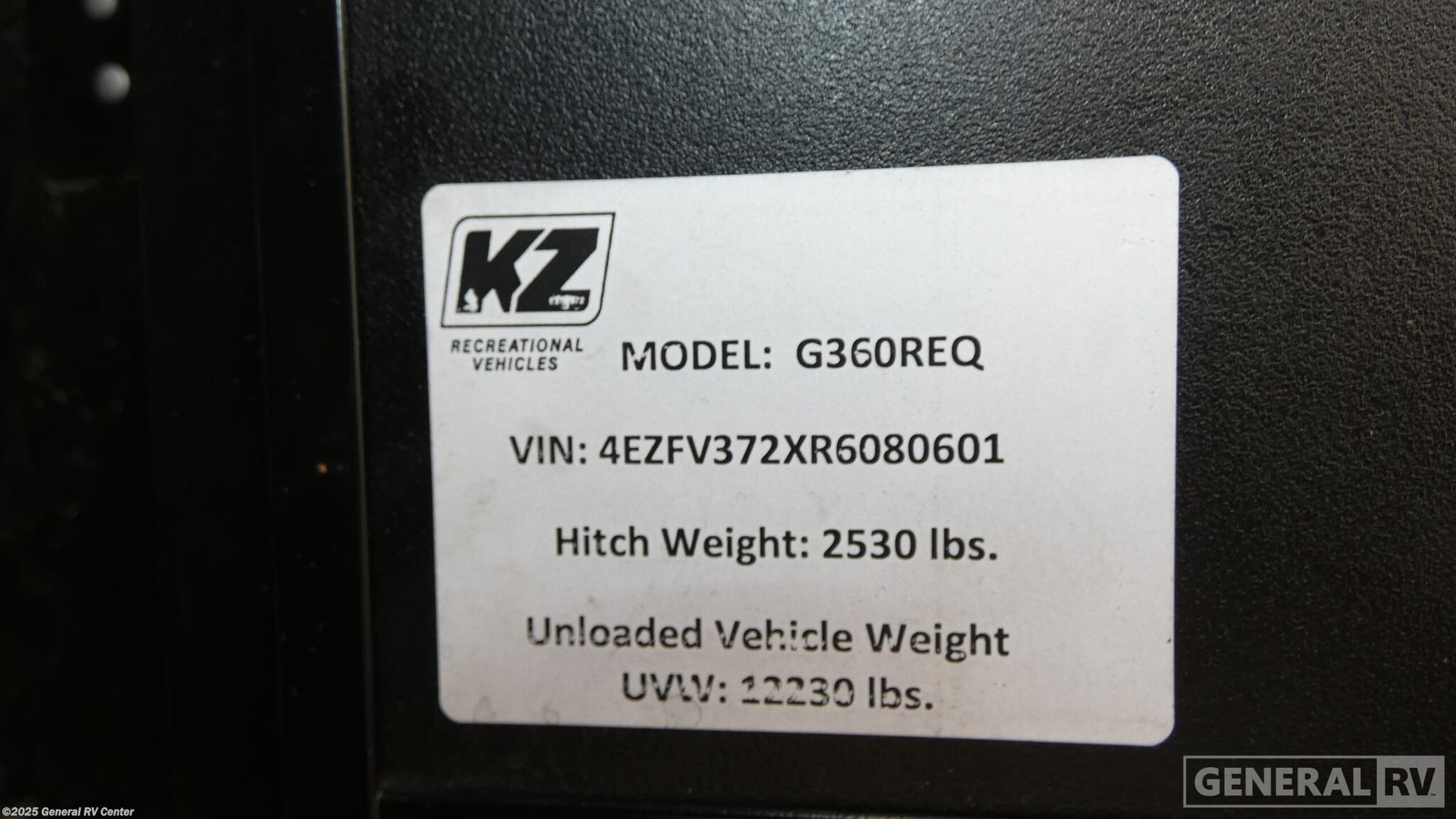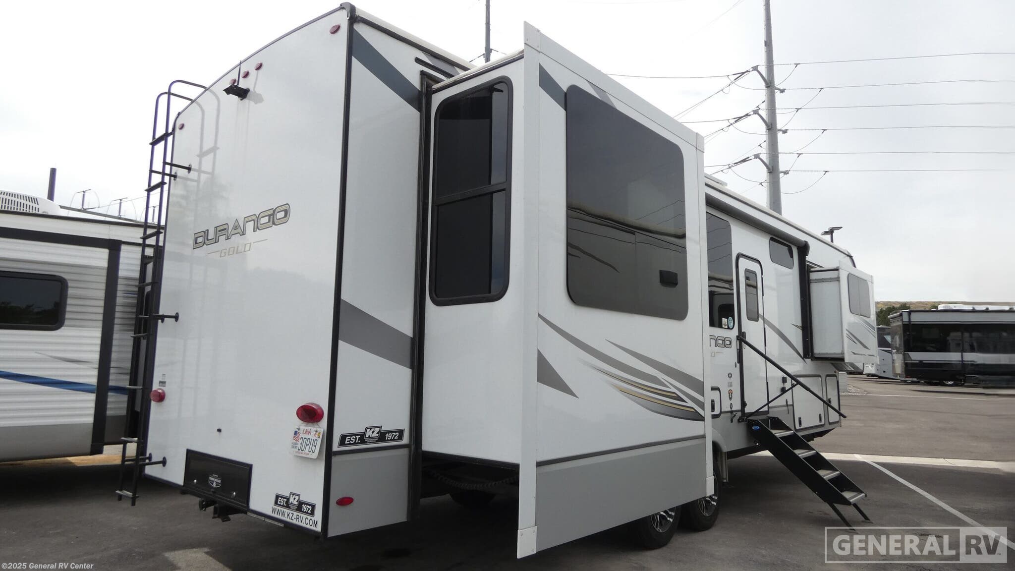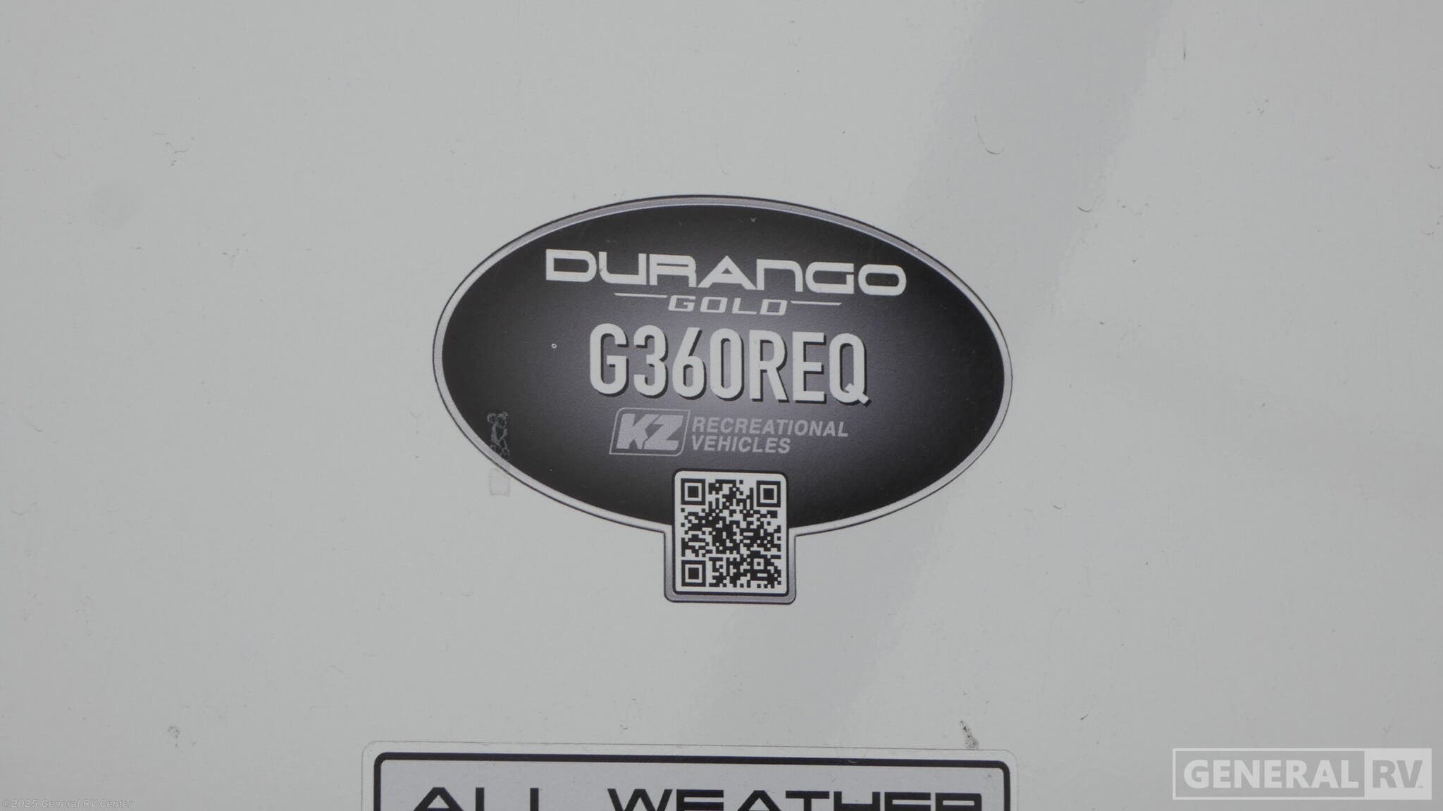 Experience the pinnacle of luxury and comfort with the 2024 KZ Durango Gold G360REQ. This fifth wheel is designed to be your home away from home, offering ample space and high-end features that make every journey memorable. With its spacious floorplan, including a center kitchen and rear living area, you'll find a perfect blend of functionality and style. The kitchen is a chef's delight, boasting a full-sized refrigerator, convection microwave, and a four-burner cooktop, ensuring you can whip up gourmet meals on the go. Relaxation is at the forefront in the rear living area, where plush theater seating and dual hide-a-bed sofas surround an inviting 65" TV and fireplace. The master suite promises restful nights with a king-sized electric tilt bed, and washer/dryer prep ensures convenience for extended stays. The residential shower with a seat adds a touch of spa-like luxury. With a 16-foot powered awning and outside griddle, the outdoor experience is equally enticing, perfect for enjoying the fresh air and stunning views. Visit your nearest General RV dealership to explore this remarkable RV in person.