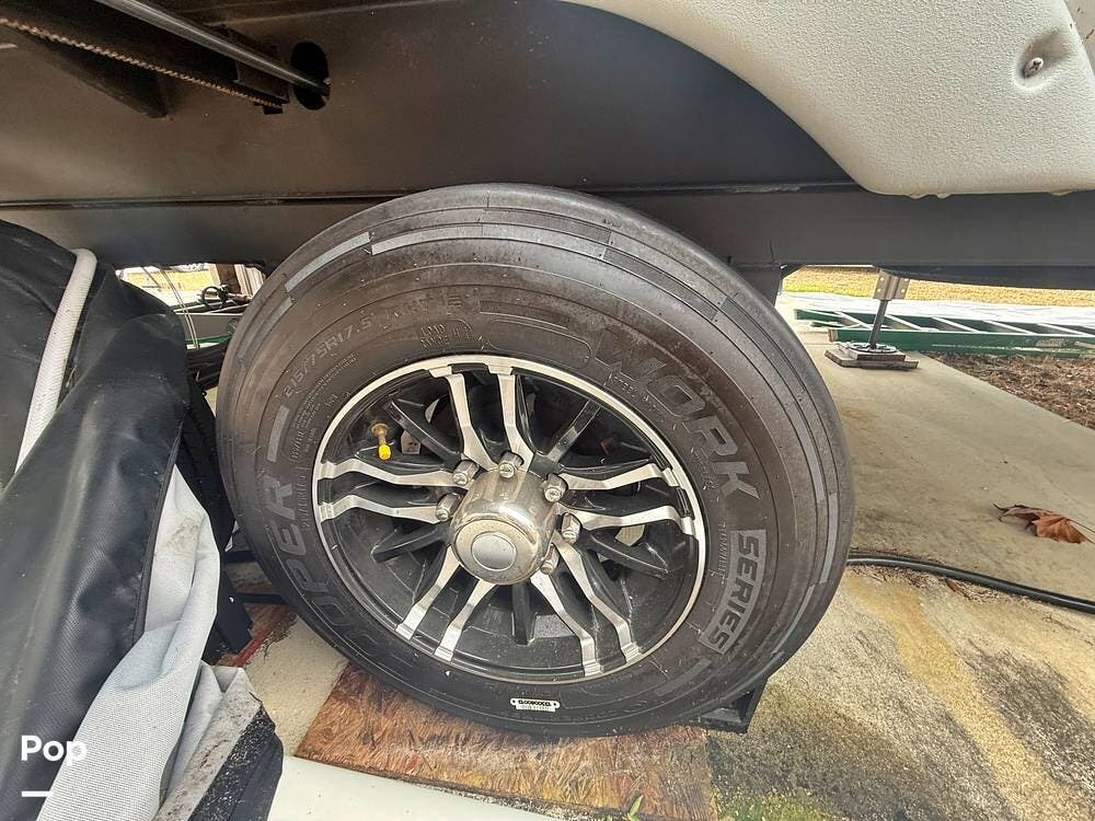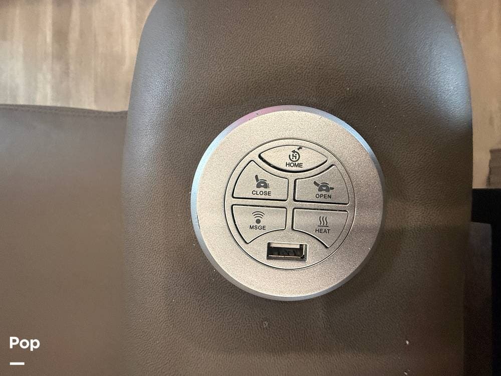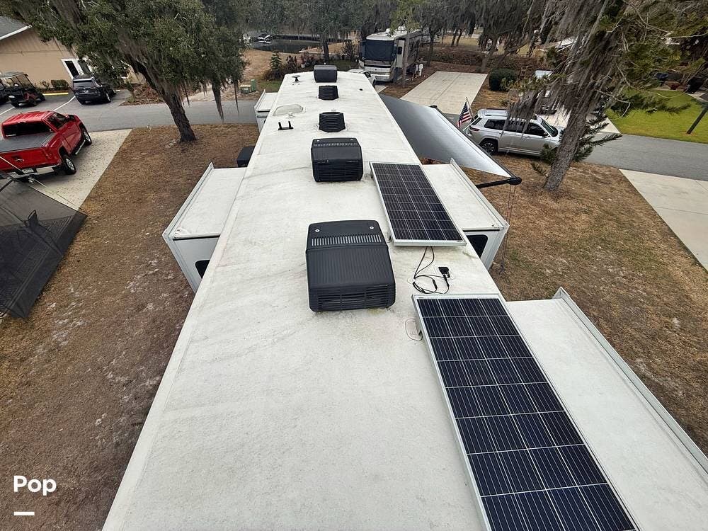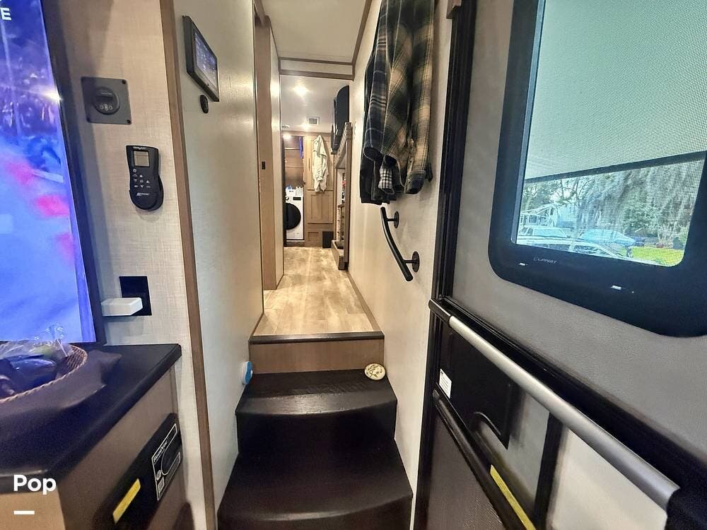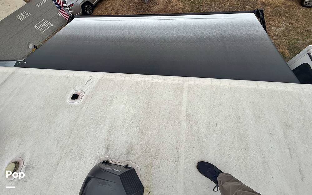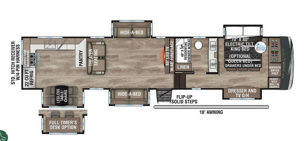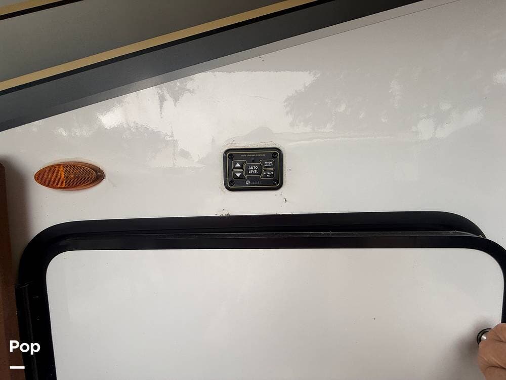 On the exterior, you will find one large awning, 5 slides, a spare tire, a roof ladder, light strips on front and awning, and auto leveling controls.