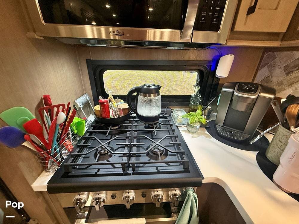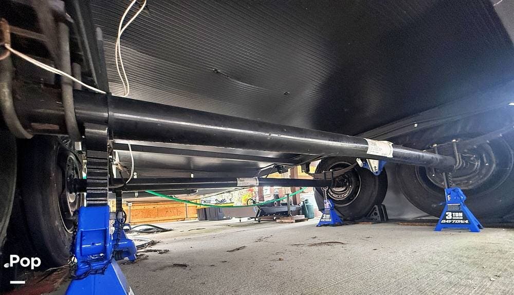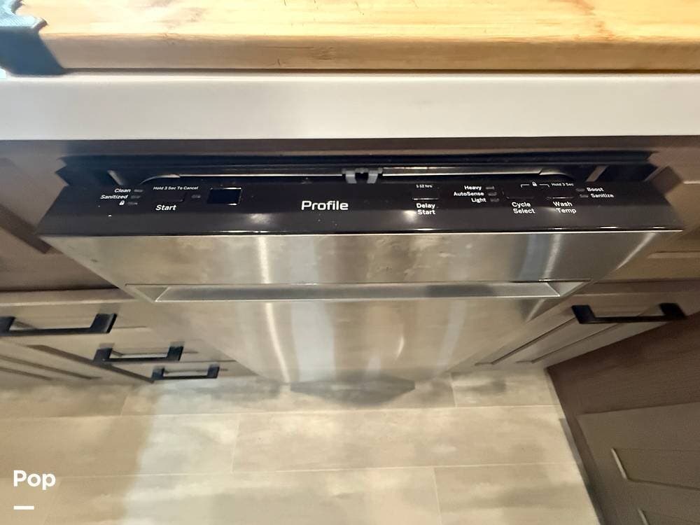 Inside, you will find a large rear kitchen with a deep, farmhouse style sink, a residential refrigerator/freezer, a full size 4 burner gas stove with a gas oven that accommodates a standard cookie sheet and full shower with seat. Uniquely, the full bath includes his-and-hers sinks.