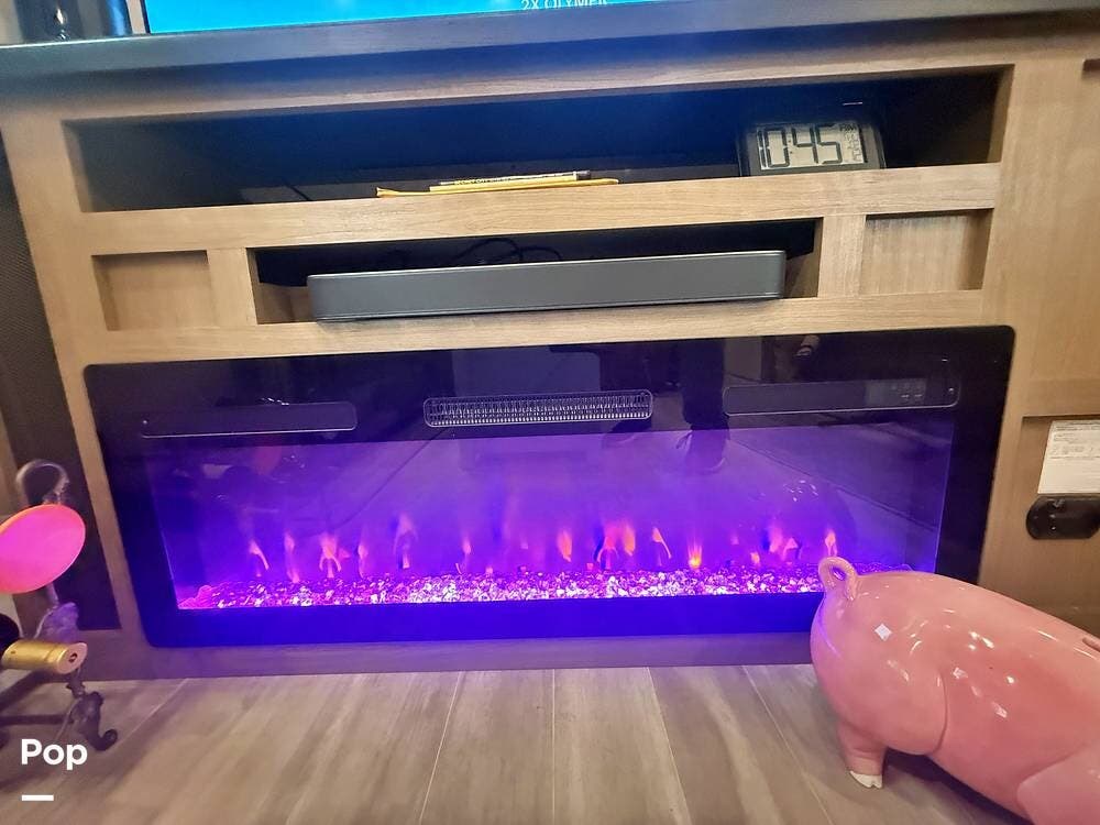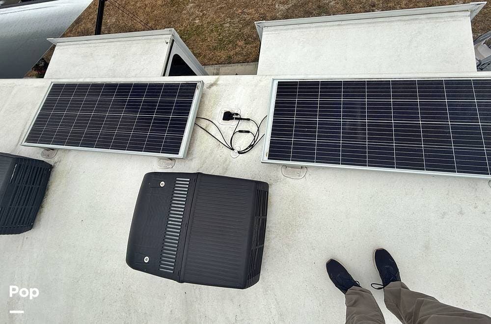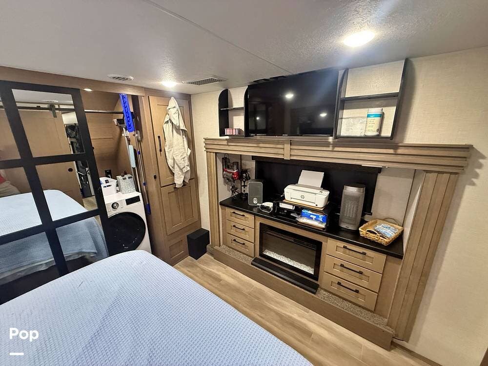 A 65-inch Bluetooth TV with sound bar sits above an electric fireplace with a shelf for additional electronic equipment. There is a TV in the bedroom which has a queen bed. Two 200 watt solar panels are located on the roof.