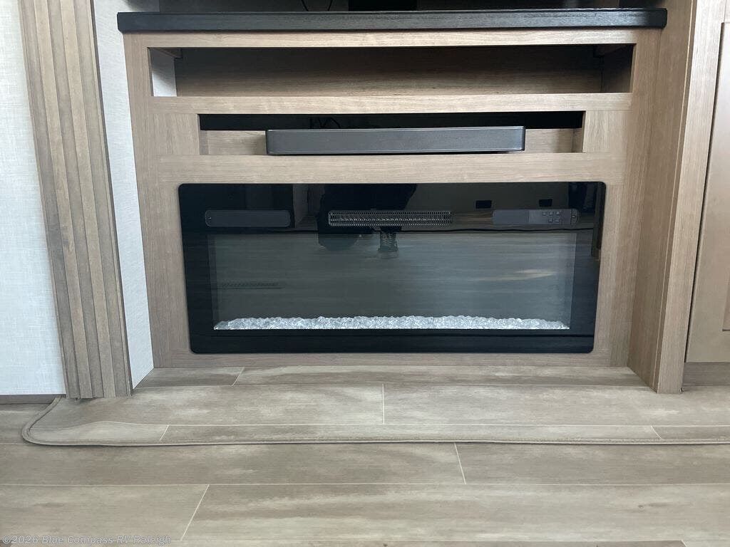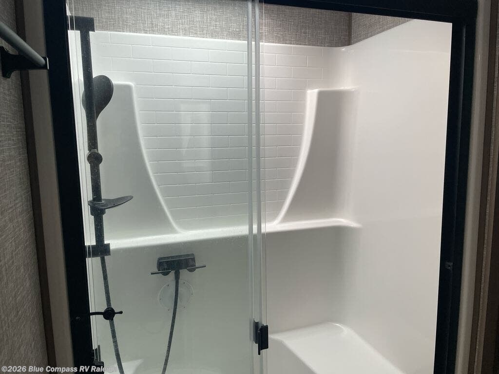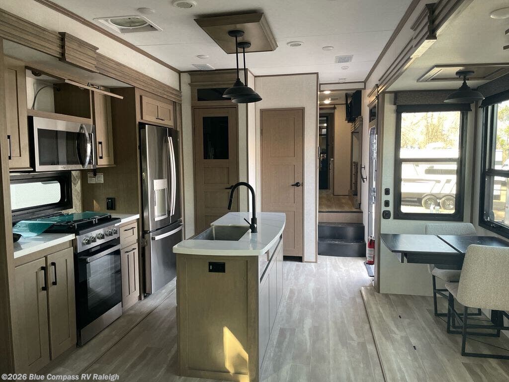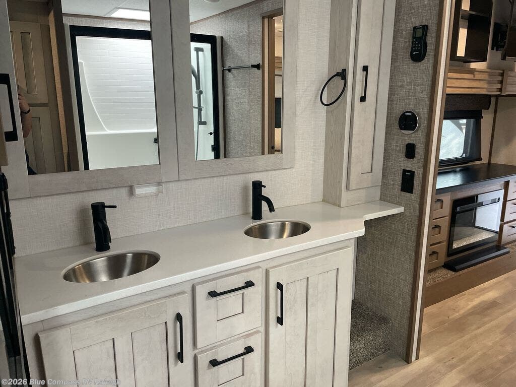 With a bath and a half, everyone will stay clean in this fifth wheel! The front full bathroom has a dual sink vanity for two to get ready at once, a 48" x 30" shower with a seat, and a front closet with washer and dryer prep if you want to add those appliances. You can enter into the master suite from the bathroom and relax on the electric tilt king bed slide, store your things in the underbed drawers, and watch a movie in bed with the Smart LED TV. The half bathroom is directly off of the kitchen for easy access while you are preparing dinner at the four burner cooktop with a 24" oven and kitchen island which also has a dishwasher for easy clean ups. Eat your meals at the legless table with chairs and then let your stomach settle while relaxing on the rear hide-a-bed sofa or theater seating across from the entertainment center with 40" fireplace!