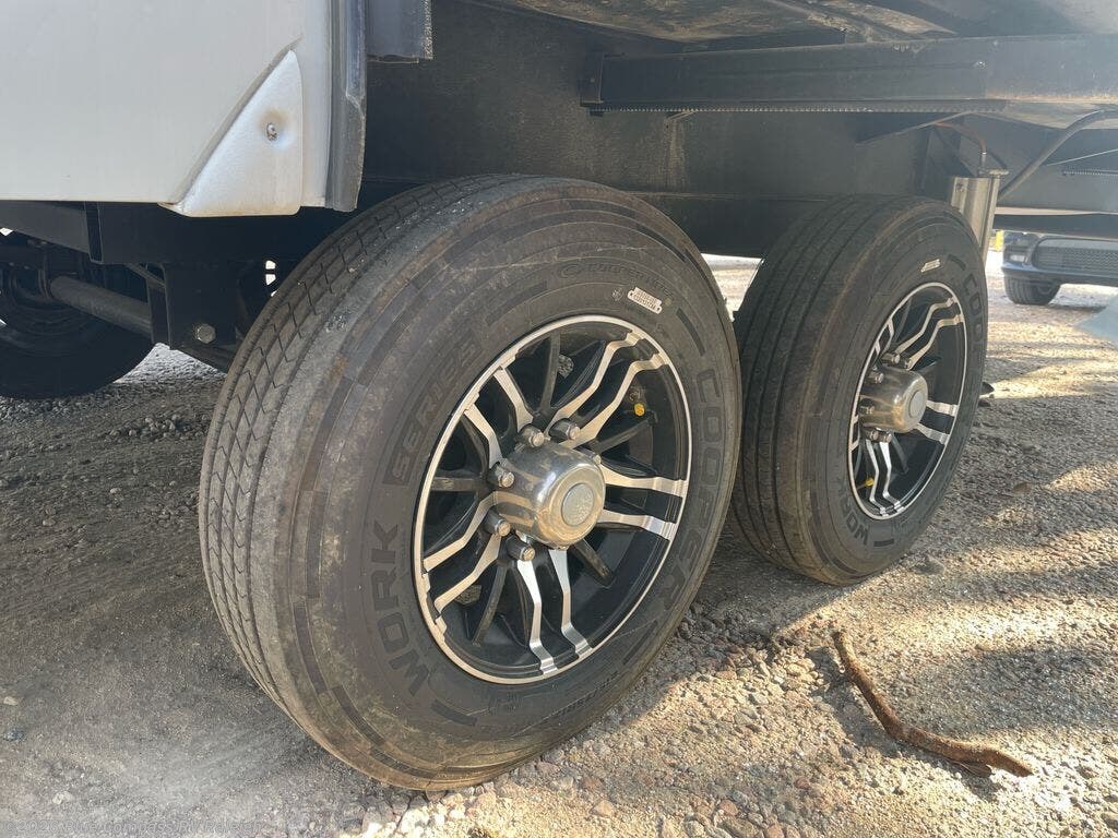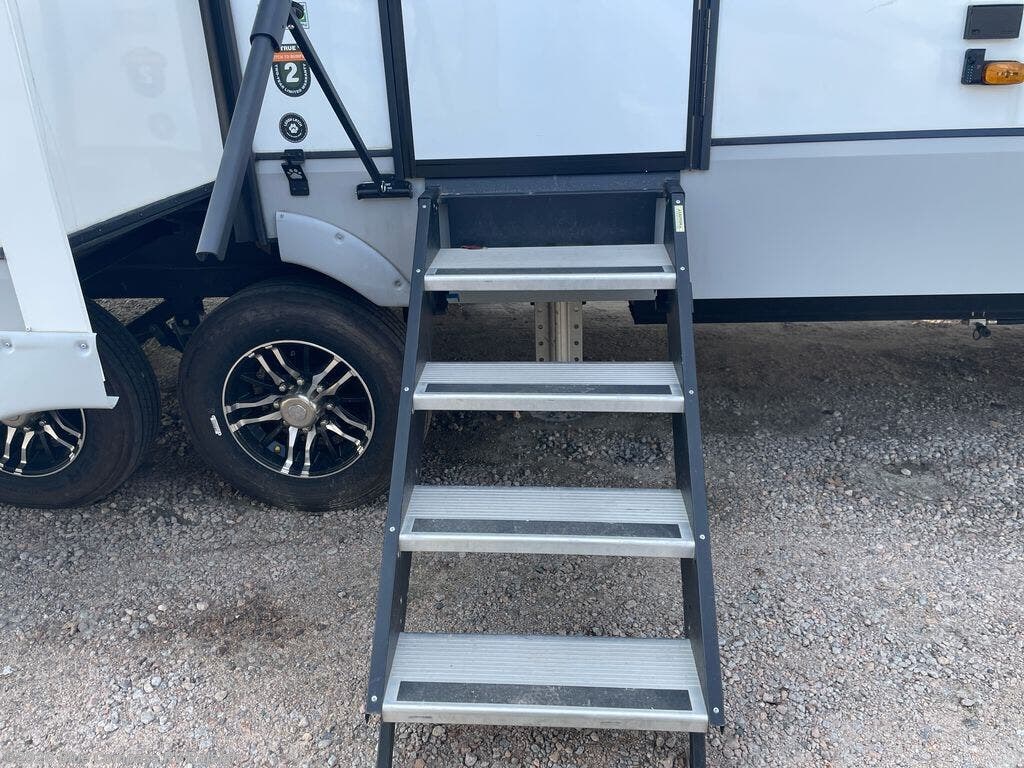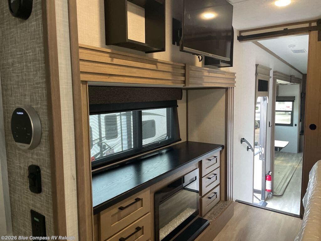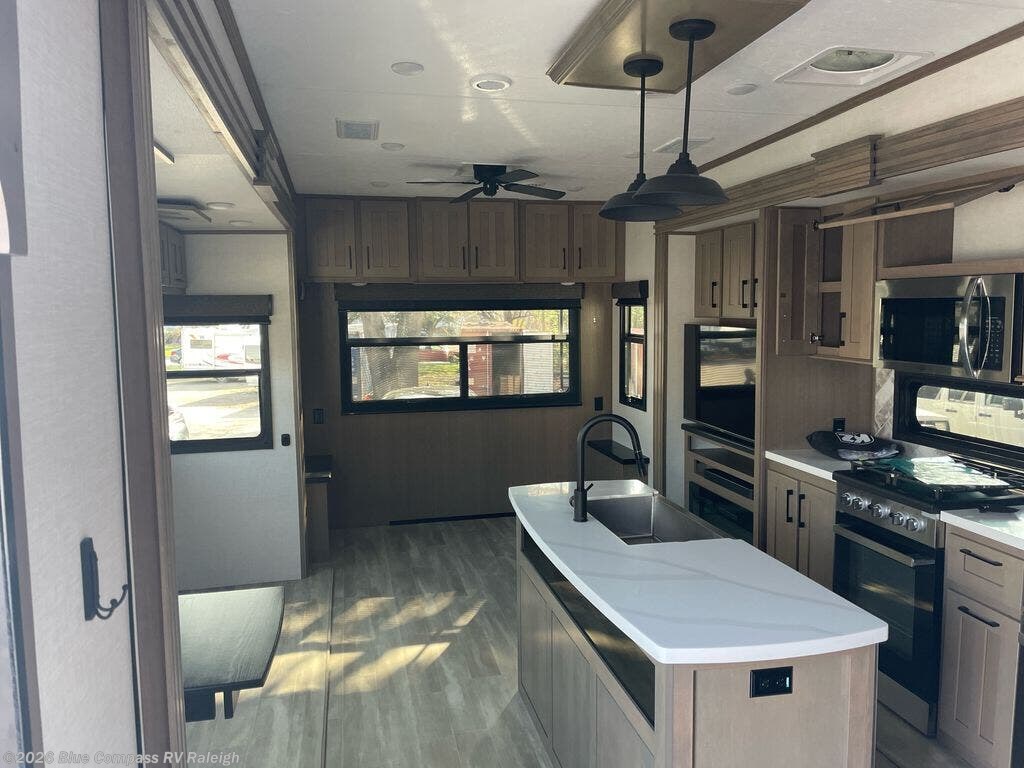 With a bath and a half, everyone will stay clean in this fifth wheel! The front full bathroom has a dual sink vanity for two to get ready at once, a 48" x 30" shower with a seat, and a front closet with washer and dryer prep if you want to add those appliances. You can enter into the master suite from the bathroom and relax on the electric tilt king bed slide, store your things in the underbed drawers, and watch a movie in bed with the Smart LED TV. The half bathroom is directly off of the kitchen for easy access while you are preparing dinner at the four burner cooktop with a 24" oven and kitchen island which also has a dishwasher for easy clean ups. Eat your meals at the legless table with chairs and then let your stomach settle while relaxing on the rear hide-a-bed sofa or theater seating across from the entertainment center with 40" fireplace!