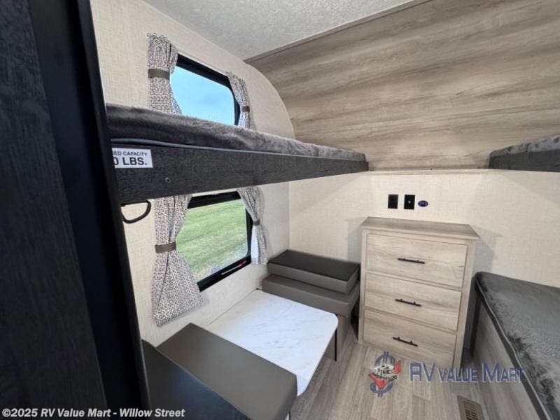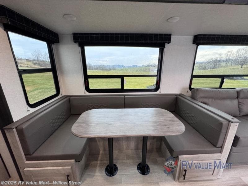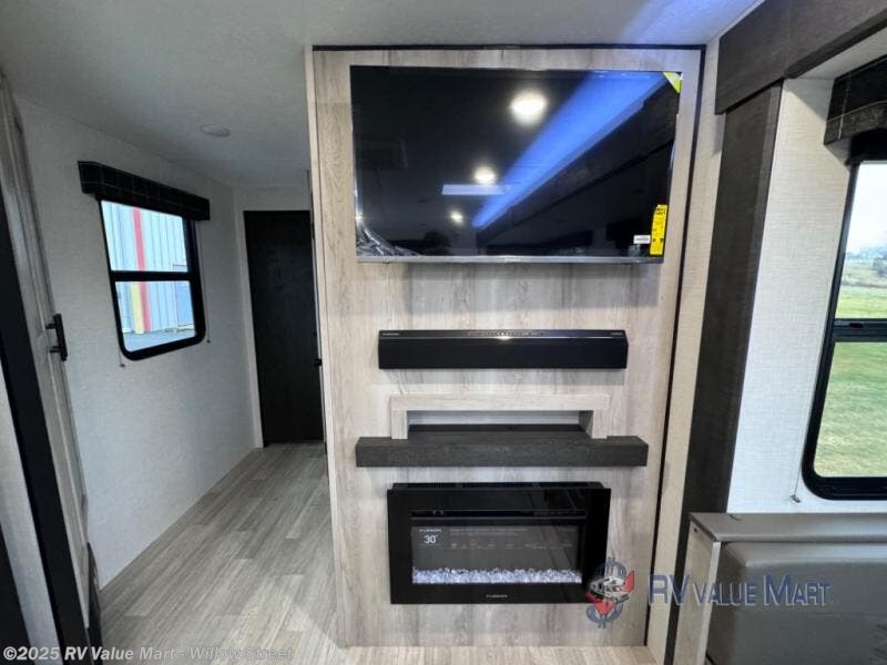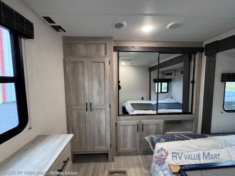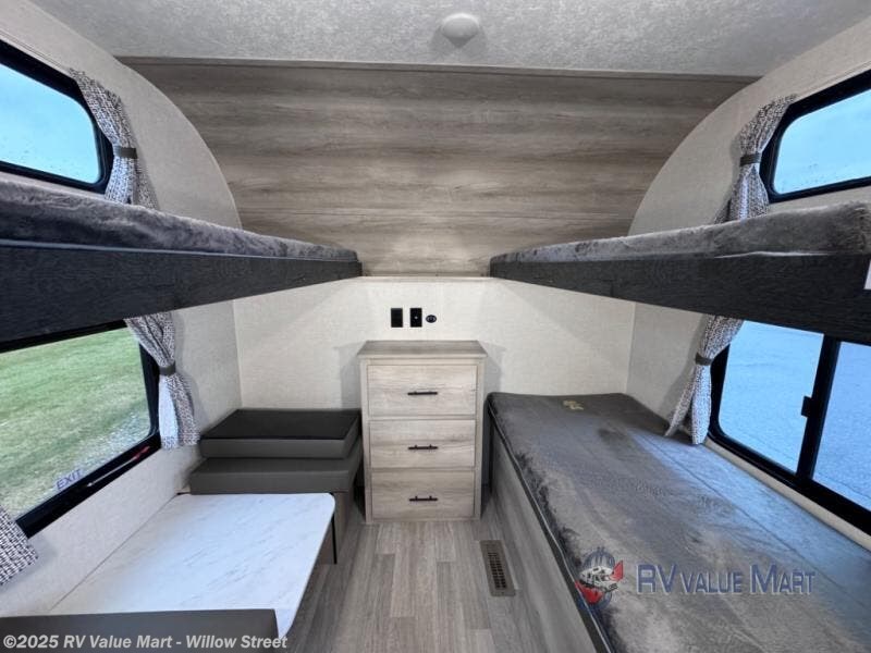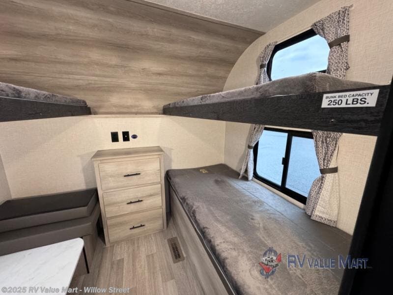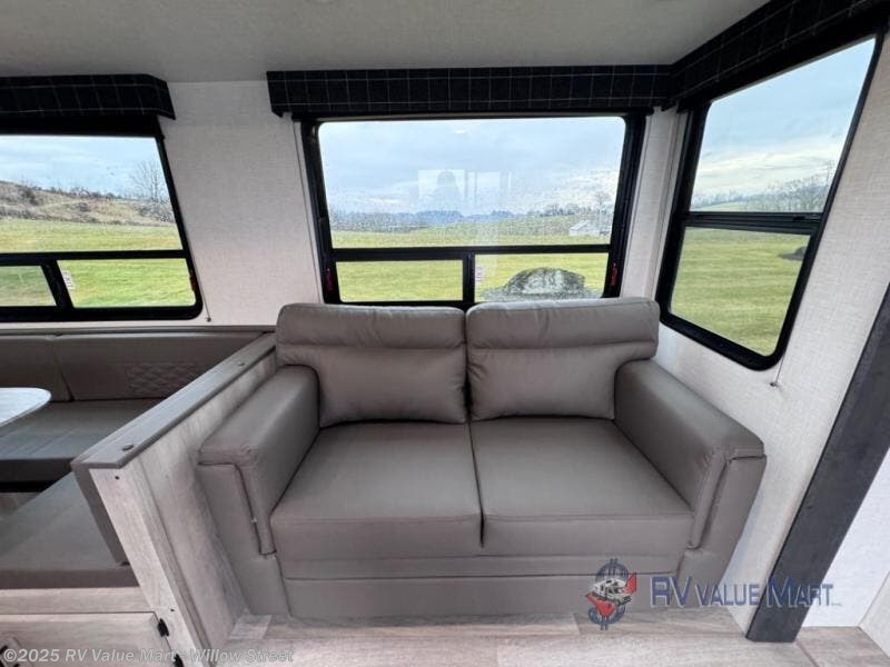 Pack your bags and park this destination trailer at your favorite spot! The kiddos or guests can sleep in the front private bunkhouse with the set of 34" x 72" bunk beds and the bunk above the 28" dinette, plus there is a closet to store their clothes and a TV for their entertainment. You will enjoy your own privacy with the rear private bedroom which has a king bed slide, a dresser with a TV, and a wardrobe with washer and dryer prep. One of the dual entry doors even leads directly into the private bedroom. The main living area includes a second slide out with the U-shaped dinette and hide-a-bed sofa, or you can choose the optional theater seating. Everyone can freshen up in the full bathroom with the radius shower and keep their bellies full with a three burner cooktop.