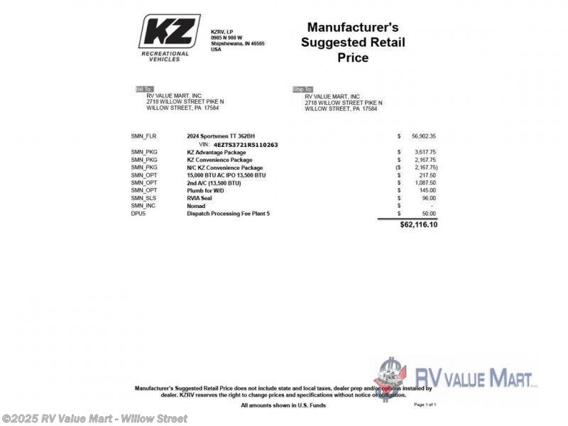 Request More Info on this 2024 K-Z Sportsmen 362BH Offered for sale by RV Value Mart - Willow Street