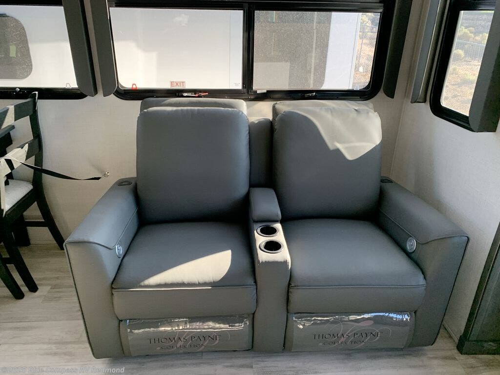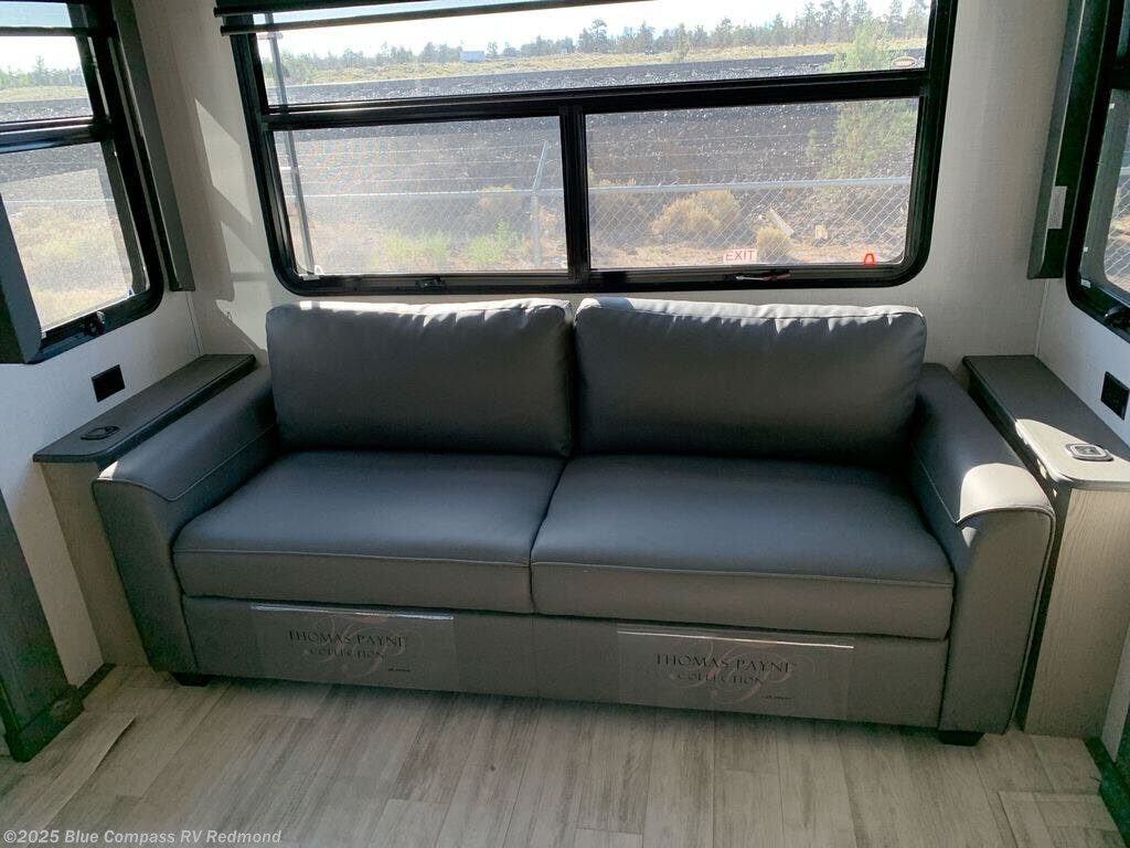A great coach for an adventurous couple that loves to travel. This Alpine fifth wheel features wide open spaces thanks to triple slides with dual opposing slides in the main combined living and kitchen area. A center island with a sink is great for prep work, and you can easily entertain and have overnight guests with a hide-a-bed sofa sleeper. There is an entertainment center with a fireplace to enjoy when inside, and theater seating opposite for movie night. The chef will appreciate the full kitchen with an 18 cu. ft. residential refrigerator, a range hood, plus a convection microwave and a pull-out countertop to prep meals. Head up to the master suite which features a dual entry bath including a linen cabinet and large shower, plus a king bed that slides out and includes storage space underneath for extra blankets. There is also a master closet, a dresser with a Smart HDTV, and stackable washer and dryer prep if you plan to go full-time!