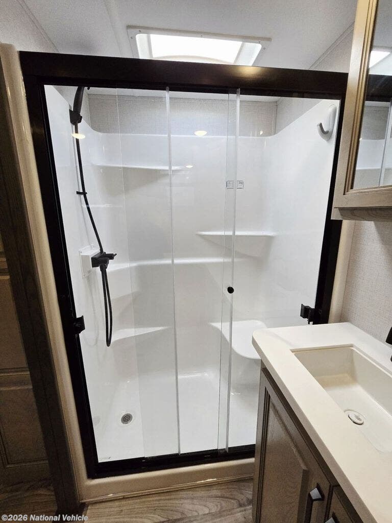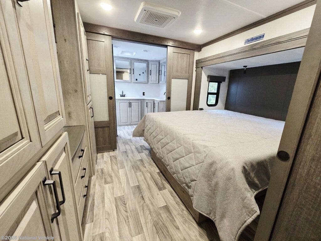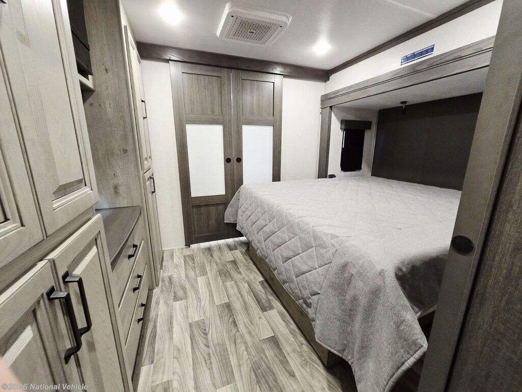 The central kitchen is built for real living, offering solid-surface countertops, an 18 cu. ft. residential refrigerator, large prep areas, and premium appliances?making it ideal for extended stays or full-time travel.