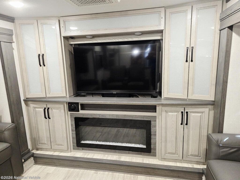 Stretching over 41 feet with five slide-outs, this coach delivers an incredibly spacious layout centered around a stunning front living room, featuring opposing sofas, theater seating, a fireplace, and a large entertainment area?perfect for relaxing or hosting guests.