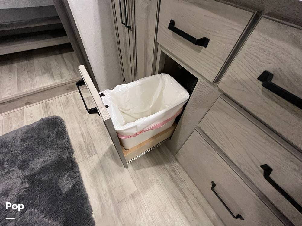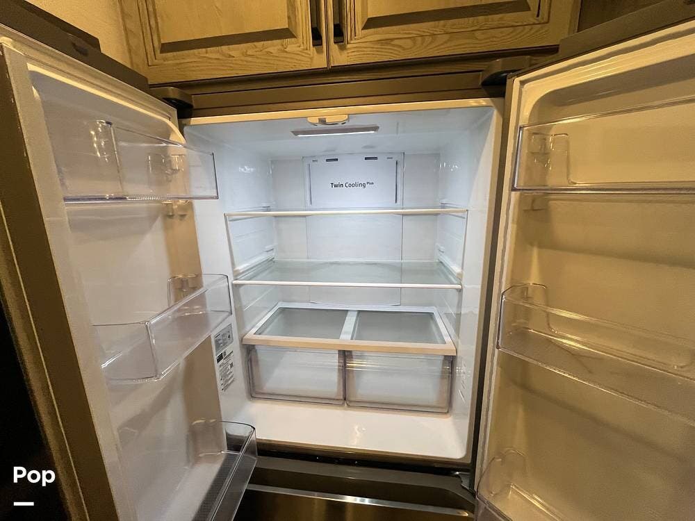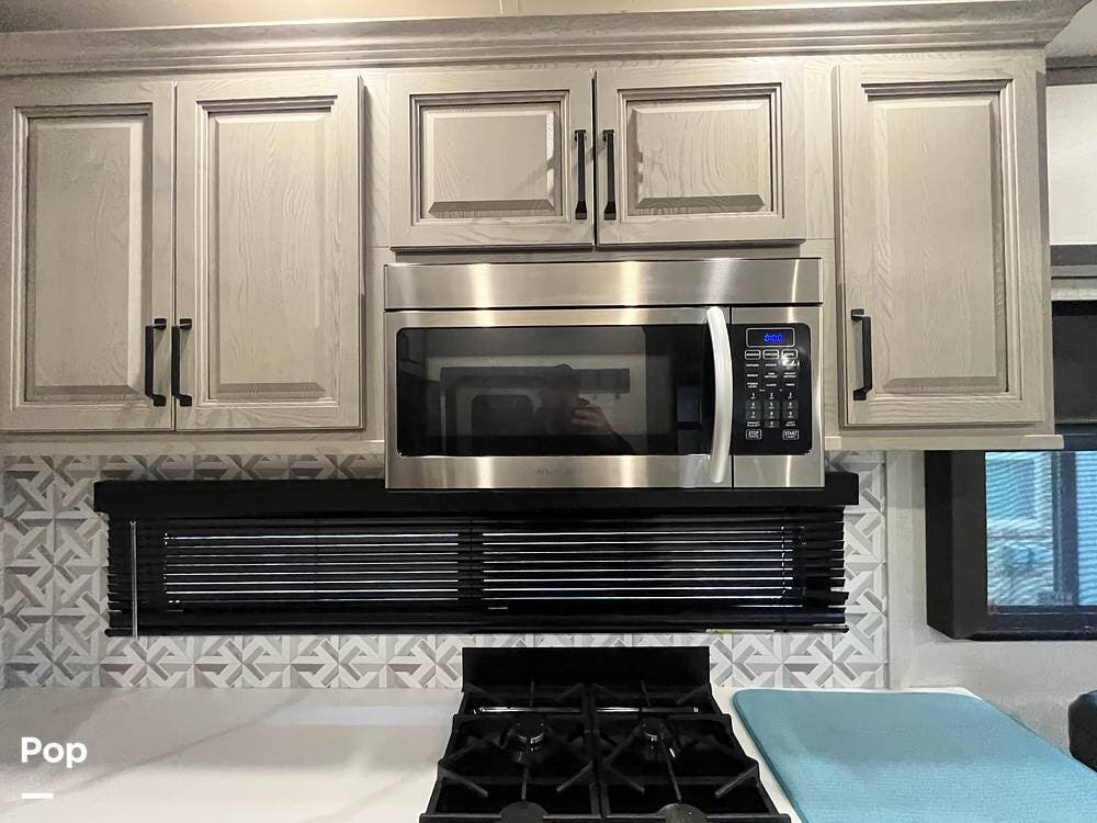 With a bath and a half, this fifth wheel is a perfect choice for your next camping trip. One of the dual entry doors leads directly into the rear kitchen, which features a spacious pantry and an 18 cu. ft. residential refrigerator to store your food items.