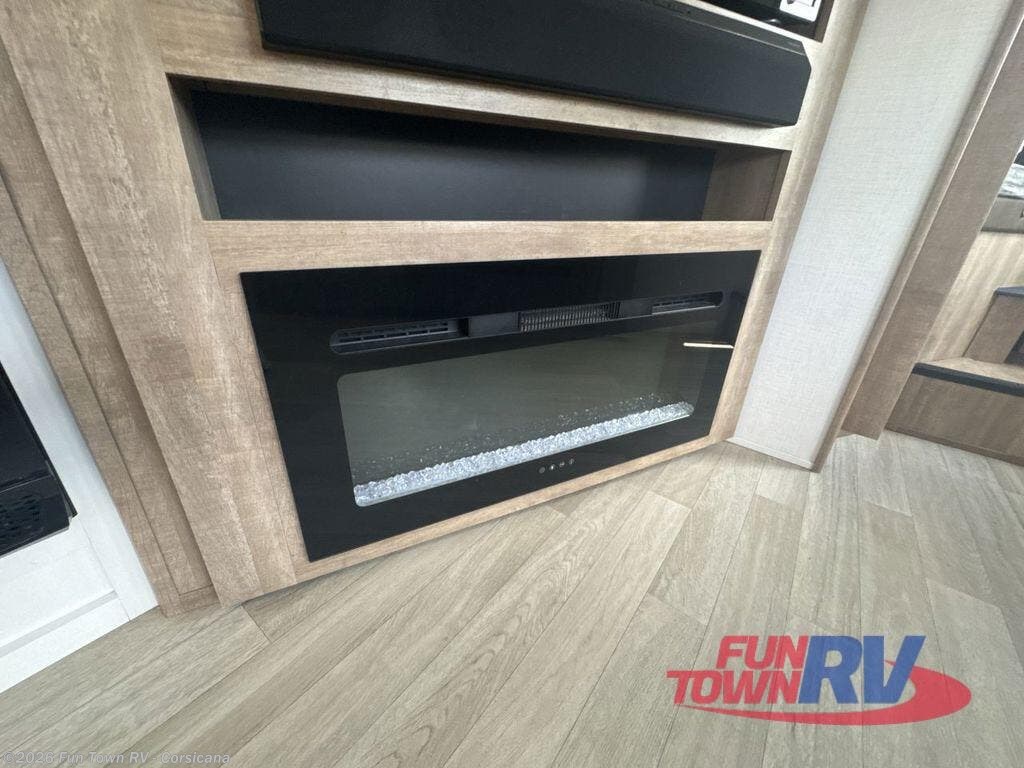 Your whole crew will love this lightweight fifth wheel that includes a rear private bunkhouse with 48" x 76" bunks for your guests and their own closet to store clothes. The front private bedroom includes a queen bed, dual nightstands, plus a wardrobe slide to keep everything tidy. Everyone can meet in the main living area with a large slide out, a booth dinette, and a theater seating across from the fireplace and hinged entertainment center. You'll also find the walk-in pantry behind the entertainment center for clever storage space. Meals can be prepared on the 21" Furrion range or in the microwave oven, and the 10 cu. ft. 12V "Solar Friendly" refrigerator will be perfect for perishables. There is also a Grill-N-Chill outside kitchen the chef of your group is sure to love!