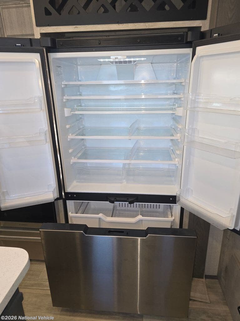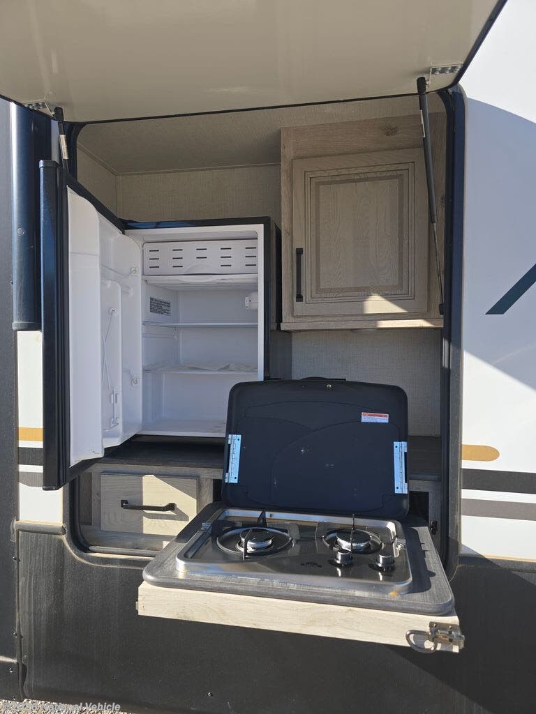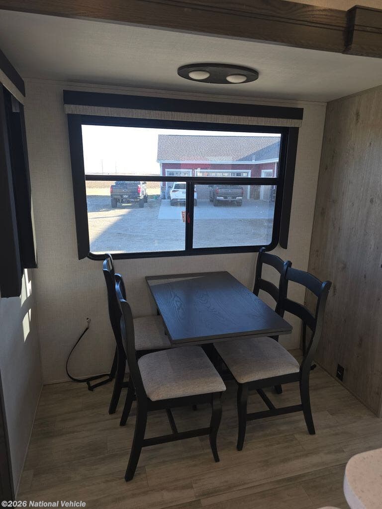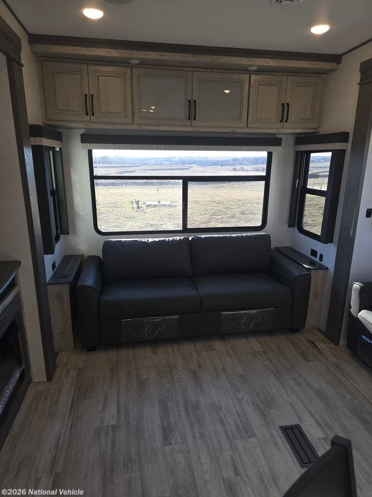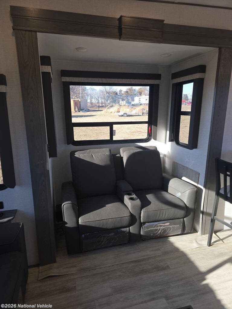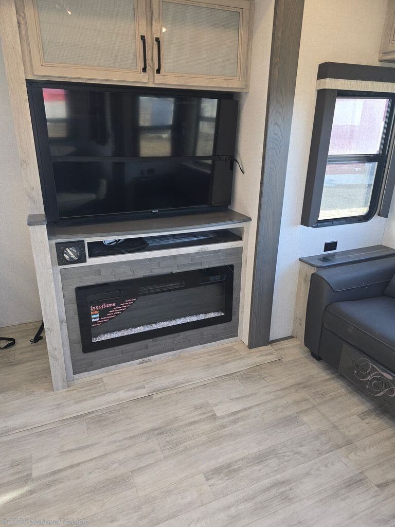 Step inside to a stunning rear living layout featuring opposing slide-outs that open the space beautifully. The living area offers plush theater seating, a comfortable sofa, and an entertainment center with a large TV and fireplace, creating a warm and inviting place to relax after a day of adventure. Large panoramic windows fill the room with natural light while providing scenic views wherever you park.