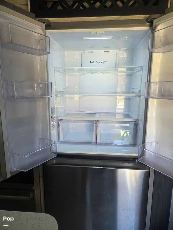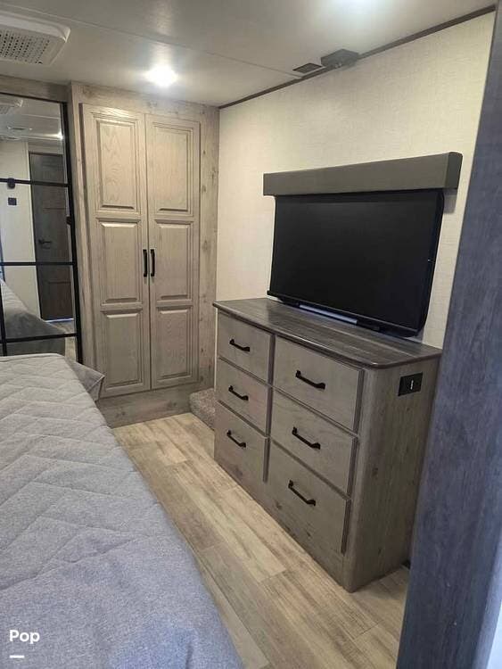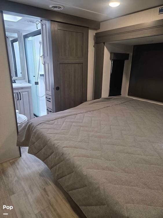 The front bedroom has a residential 70 x 80 inch King Bed, direct access to a full bath, and a large master closet. This is also where you will find the closet for a stackable washer and dryer.