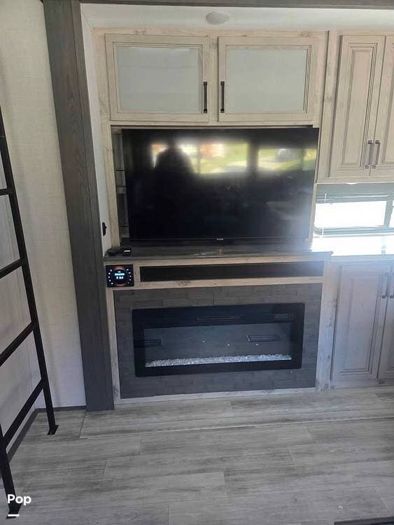 In the main living area, you find the free-standing dinette, theater seats, an entertainment center, and a fireplace.