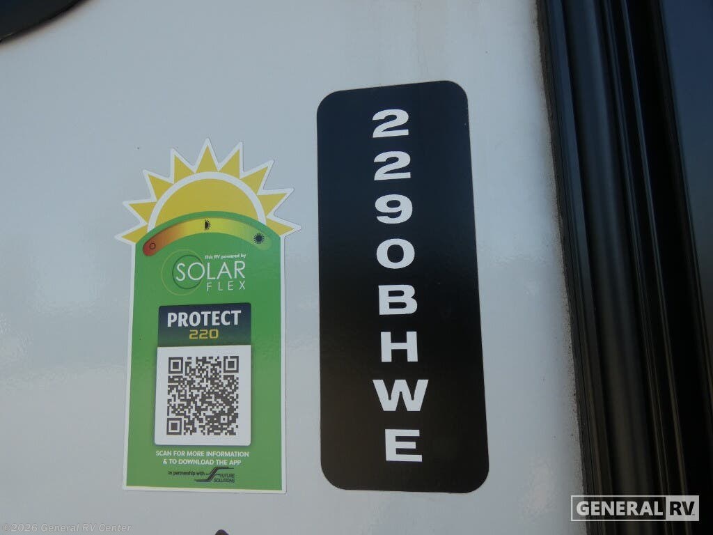 Keystone Bullet Crossfire Double Axle travel trailer 2290BHWE highlights: Flip-Up Bunk for Added Storage Large Pantry Front Private Bedroom Furrion Microwave U-Shaped Do-More Dinette Table You can easily sleep eight in this travel trailer thanks to the 51" x 74" double-size bunks, the U-shaped Do-More dinette table, and the queen bed in the front bedroom. There is a laundry chute in the bedroom that will go straight to the pass-through storage for convenience. Whip up your best meals on the three burner gas range, or use the Furrion microwave oven. You can dine around the dinette, or take your plate outdoors to sit under the 15' power awning with LED lights, plus there is an outdoor kitchen with a pull-out griddle and refrigerator. Each Bullet Crossfire Double Axle travel trailer by Keystone is constructed with a NORCO HSLA steel/automotive deposition coated frame assembled with huck bolts for durability. The TORFLEX rubber torsion suspension will provide smooth towing, and the one-piece ABS enclosed underbelly will help extend your camping season. Setting up your trailer will be a breeze with the electric tongue jack and four electric stabilizer jacks, and there is an electric awning with adjustable arms and LED lighting for an inviting outdoor living space. The affordable, high-quality RV solar energy system, SolarFlex Protect 220 comes standard with each model and will allow you to go off-grid when you want. Inside, you'll find fabric night shades, Beauflor woven flooring in the slides, full depth cabinets with full extension drawer guides, and many more comforts.