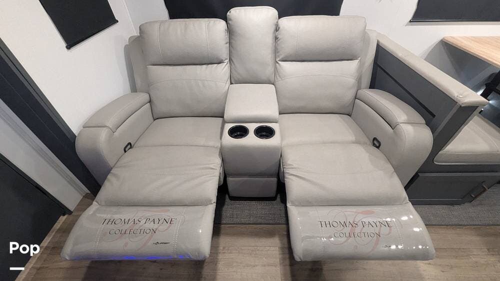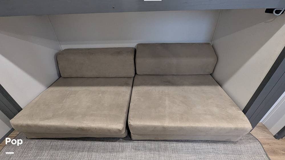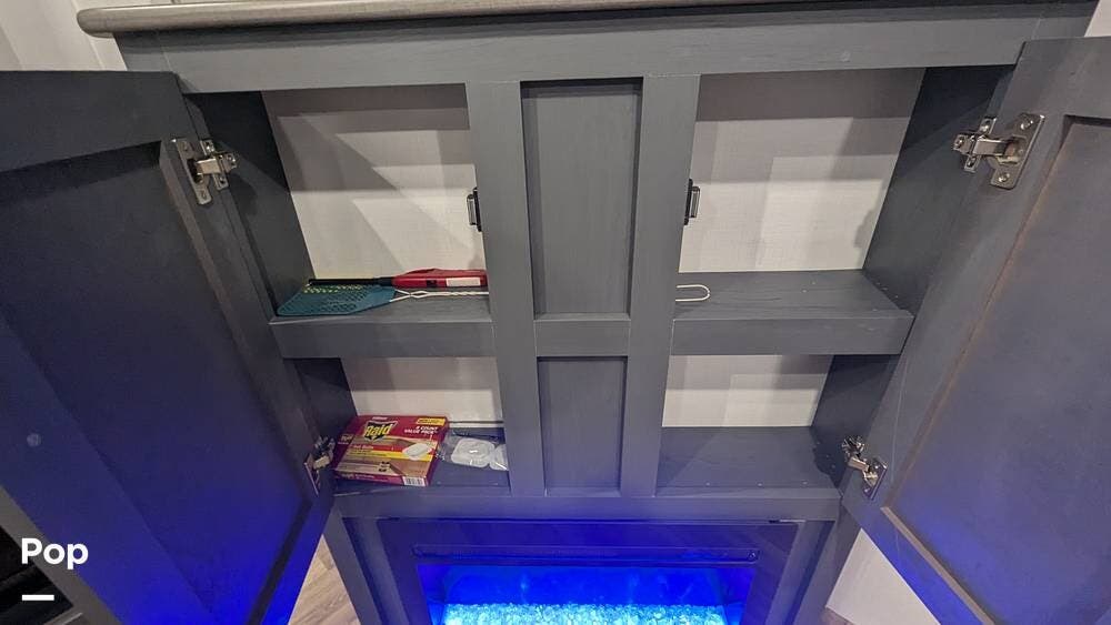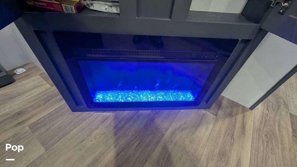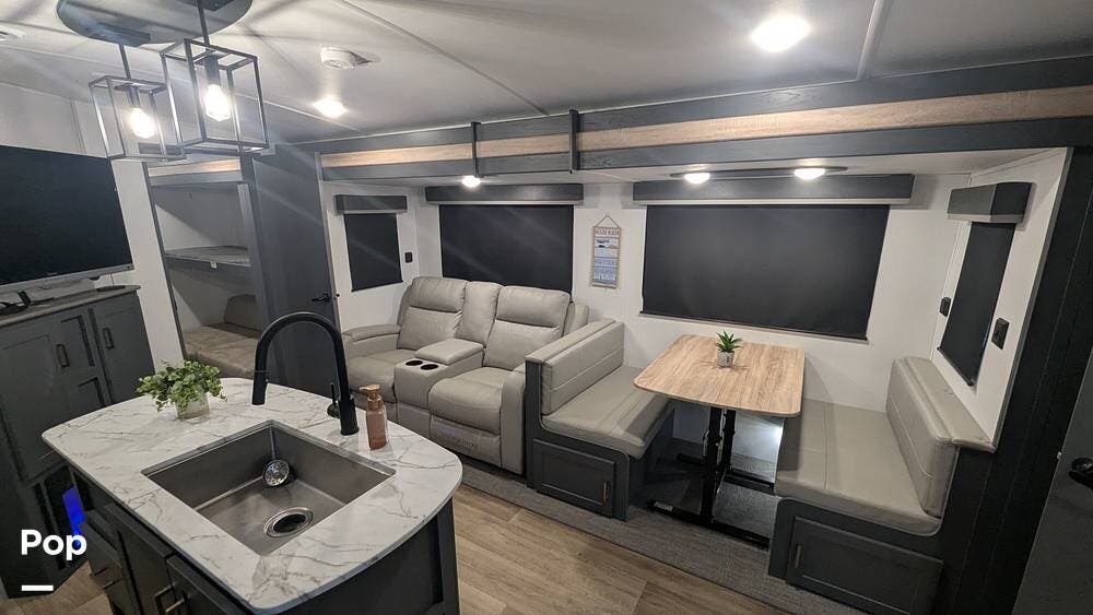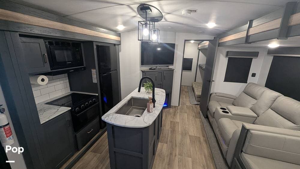 This Bunkhouse also has three slide-outs that significantly improve the livable space, and along with vaulted ceilings, a Kitchen Island, a Full-Sized 10 Cu ft Refrigerator/Freezer, a Fireplace, and Optional Theater Seating facing a 12V TV with a built-in Bluetooth Sound Bar & radio.