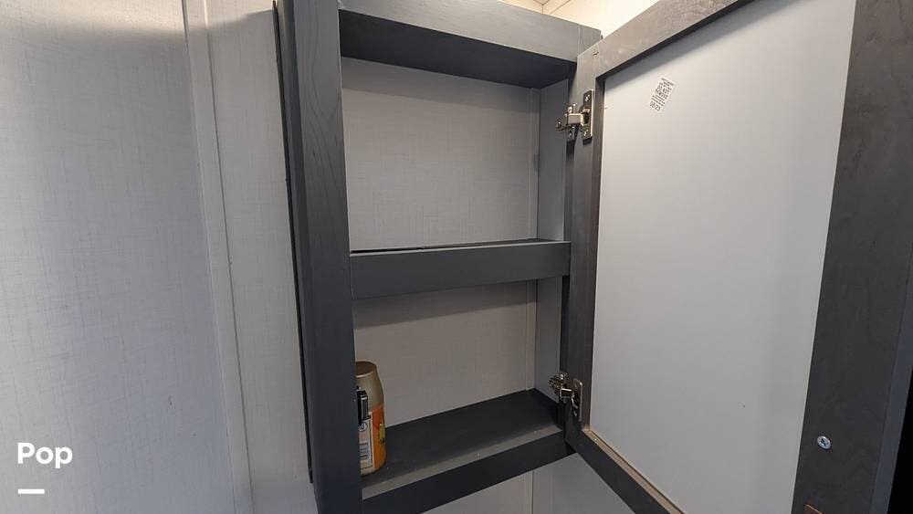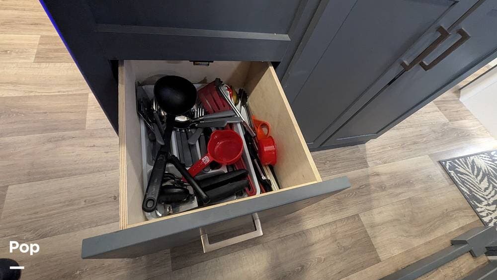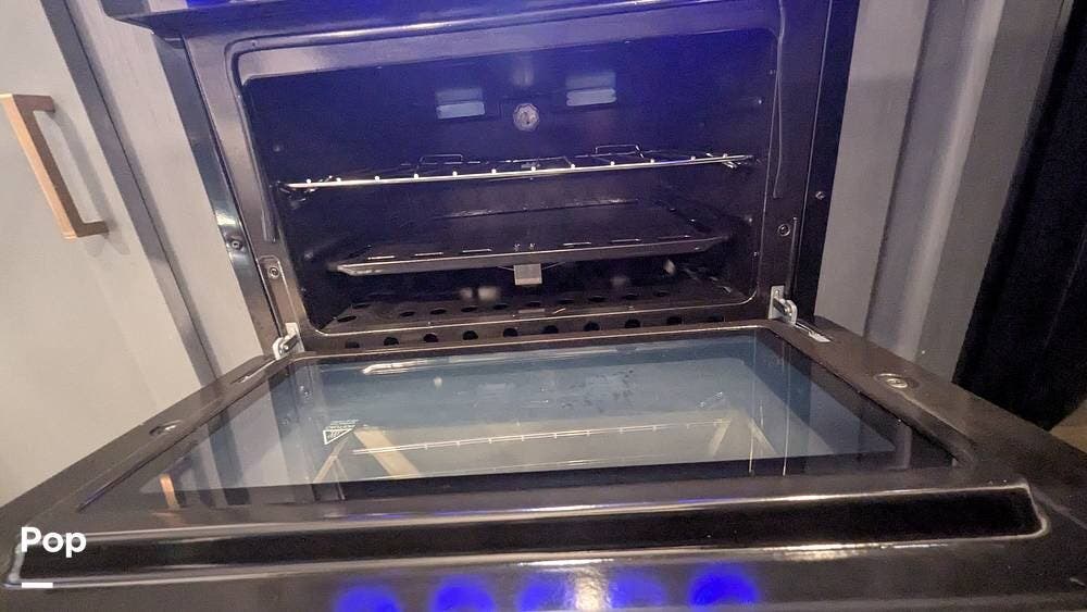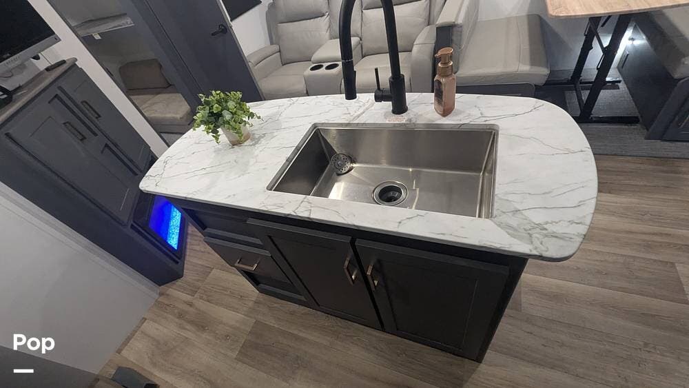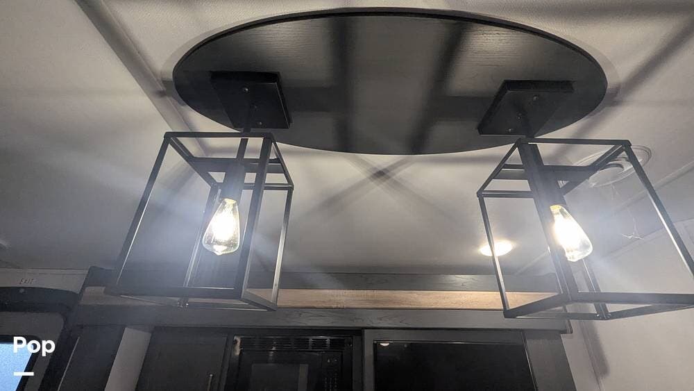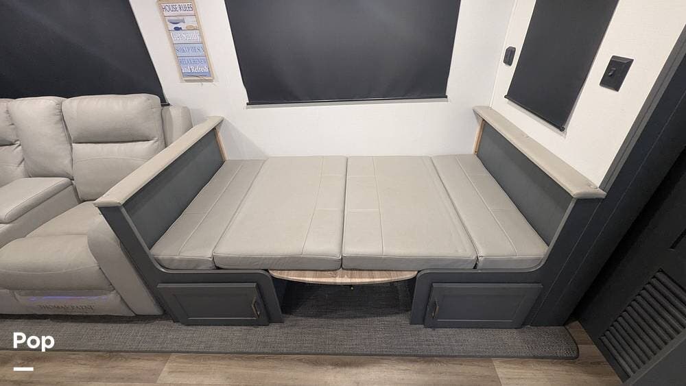This Bunkhouse also has three slide-outs that significantly improve the livable space, and along with vaulted ceilings, a Kitchen Island, a Full-Sized 10 Cu ft Refrigerator/Freezer, a Fireplace, and Optional Theater Seating facing a 12V TV with a built-in Bluetooth Sound Bar & radio.