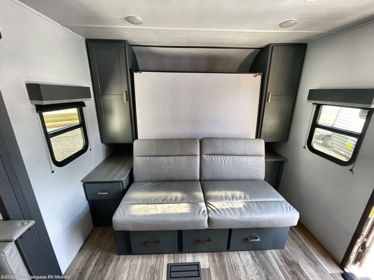 This travel trailer has everything you need for unforgettable camping trips! You'll have a front sofa to relax on during the day, and a Murphy bed behind it that can fold down when you're ready to catch some zzz's. There are also dual wardrobes and dual nightstands here to keep your clothes and belongings tidy. The U-shaped Do-More dinette table not only provides a place to dine and house overnight guests, but also gives more space since it is on a slide out! If you don't need the additional sleeping space, just choose the optional theater dinette! Preparing home cooked meals will be a breeze in the kitchen with a two burner gas range, Furrion microwave, 8 cu. ft. 12V refrigerator, plus a flip-up countertop for more prep space. There is also an outside kitchen with a pull-out griddle if you want to keep food smells outdoors!