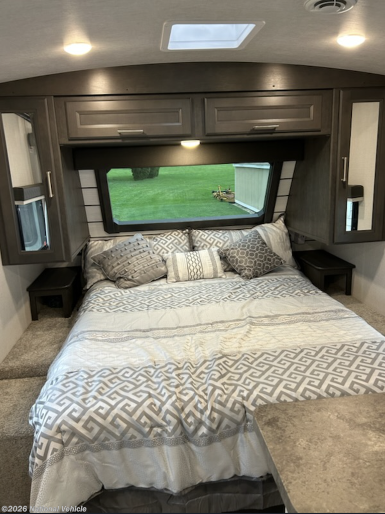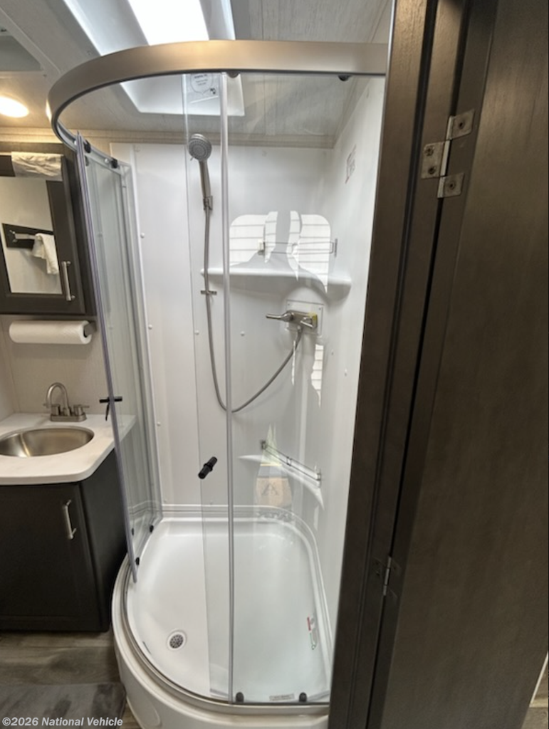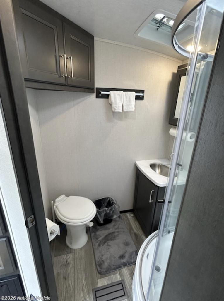 Up front, a king-size bed provides exceptional comfort, while the full rear bathroom spans the width of the trailer, delivering a roomy shower and added convenience rarely found in this size class.