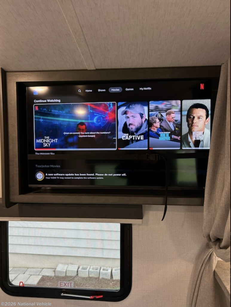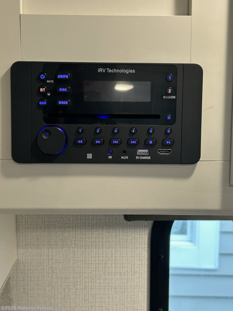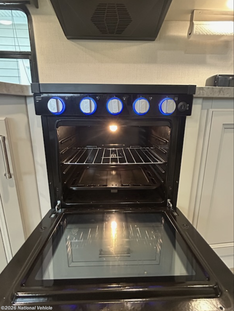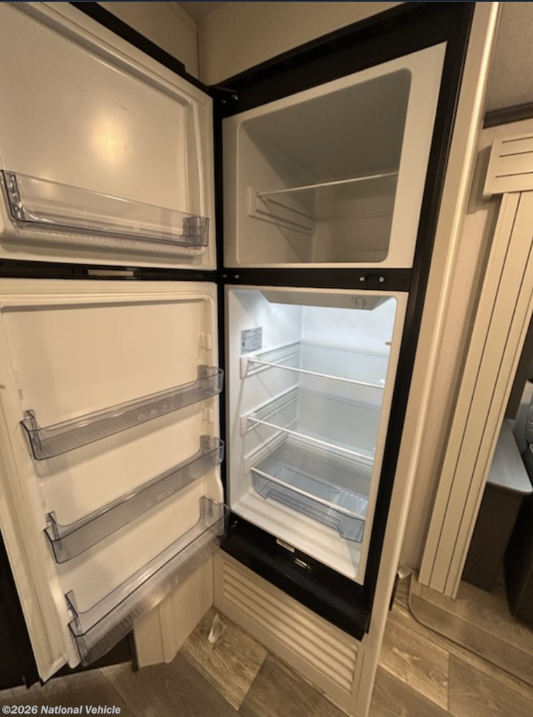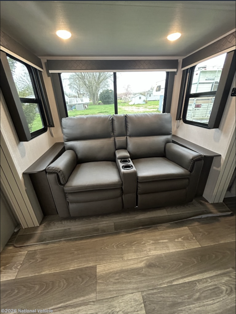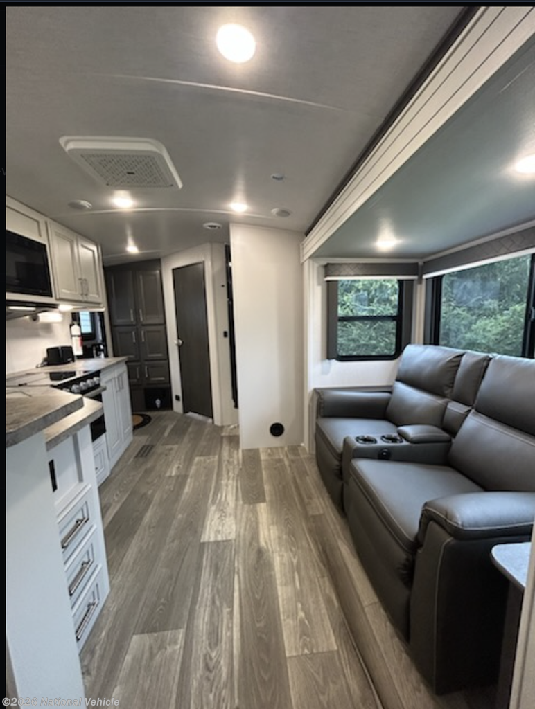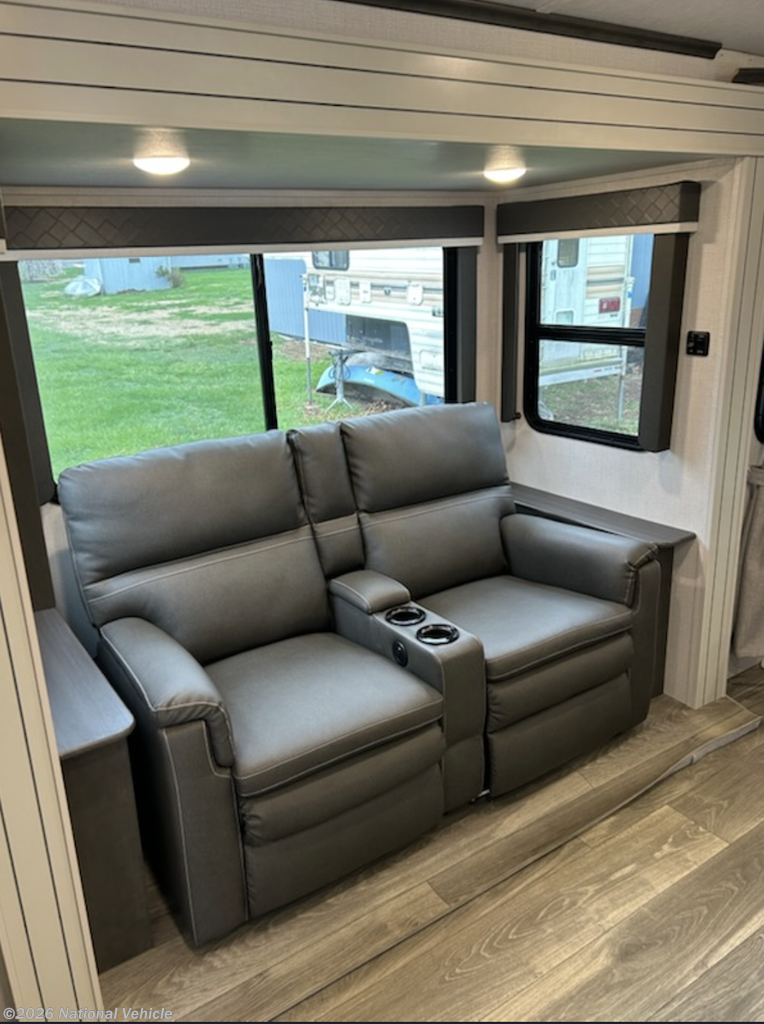 Used 2 times 2024. Has slide for theater seating, front island King bed, (new mattress) and rear corner bathroom. Equipped with ducted air conditioner, oven, microwave, double door refrigerator, rear ladder, spare tire, 400 wt solar panels, aluminum wheels, and power tongue jack.