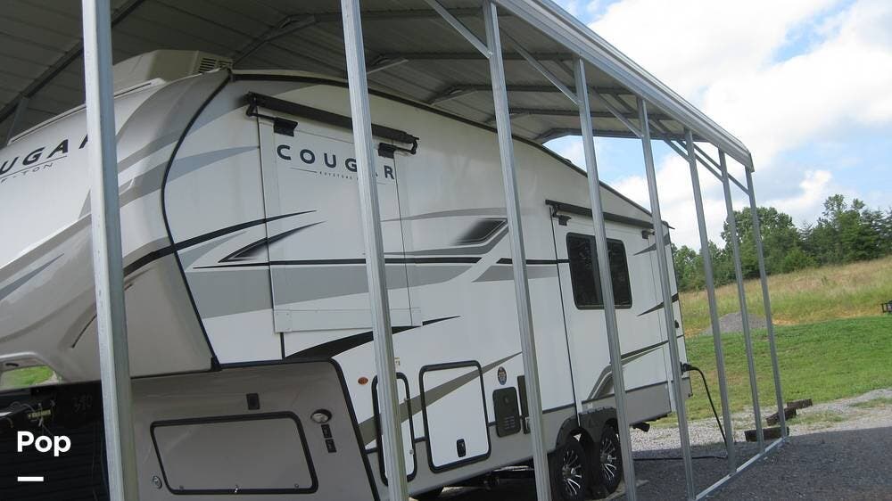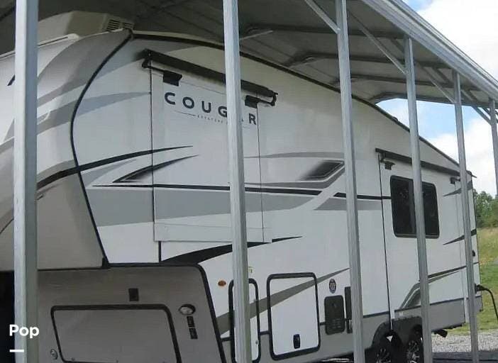 This 2024 Cougar 23MLE has been stored under cover and features 4-way power leveling, dual A/Cs, solar panels, a power awning, exterior speakers, exterior LED lighting, a roof access ladder, a tow hitch receiver, an external kitchen with a grill and mini-fridge, and much more.