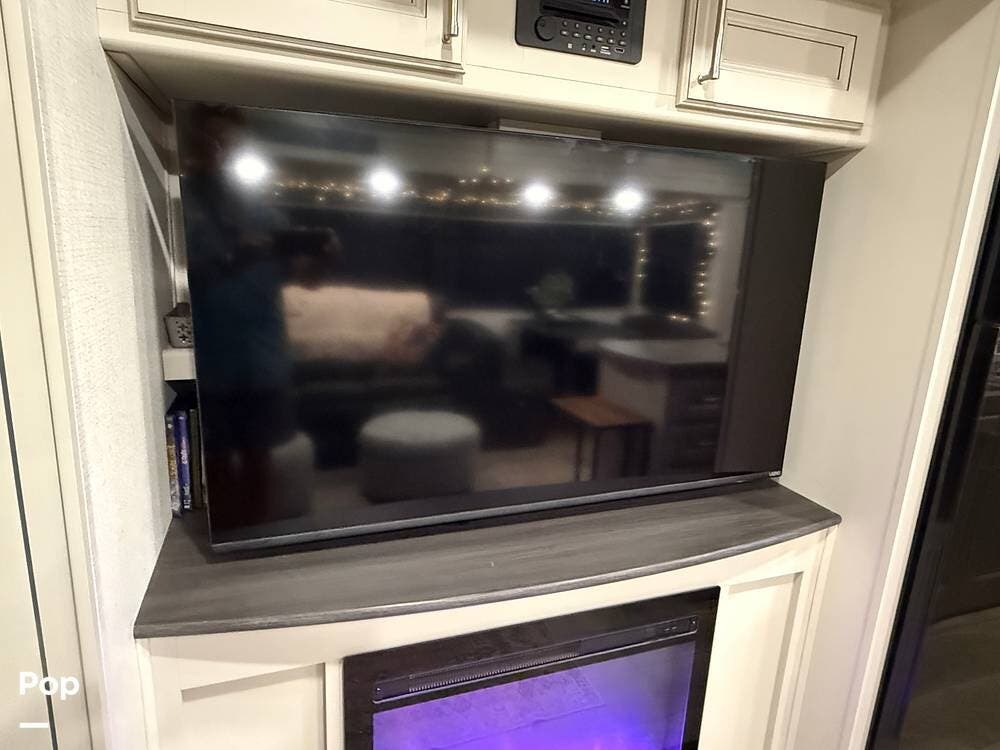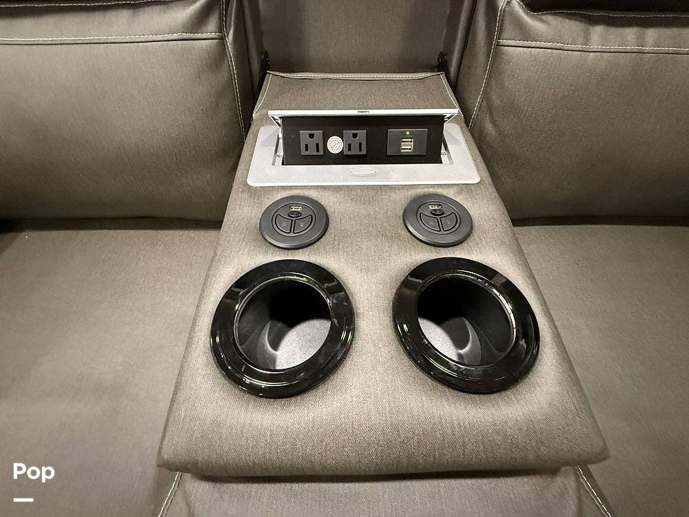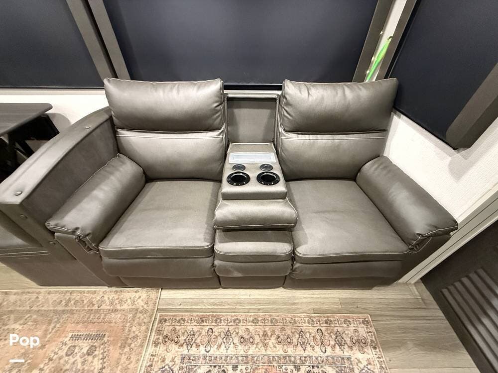 The living area is warm and inviting, complete with dual theater seating, a power center, an entertainment center featuring a large Smart LED TV, an integrated sound system, and a cozy fireplace.