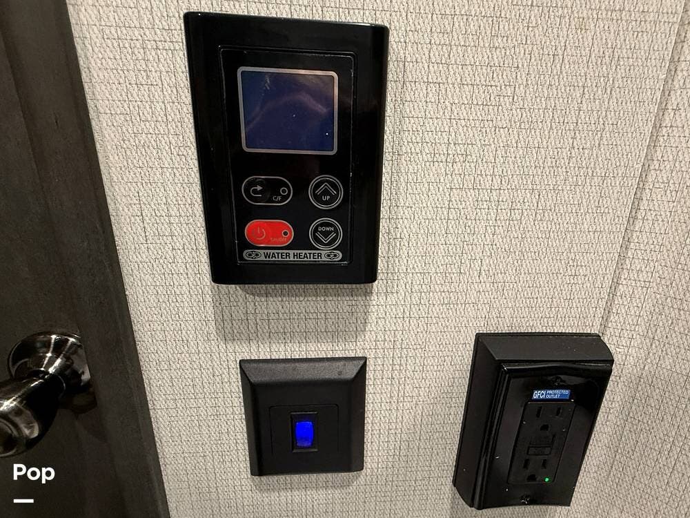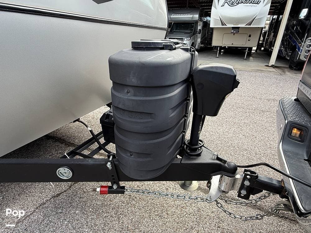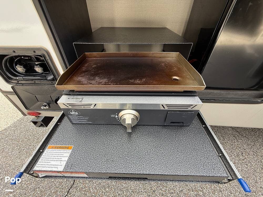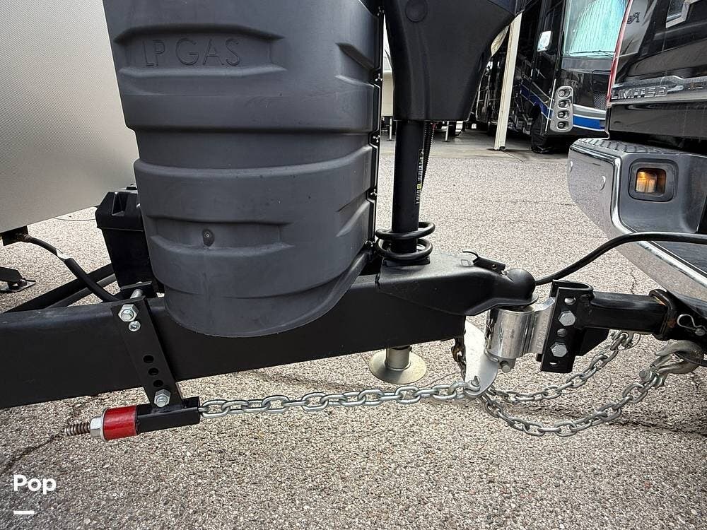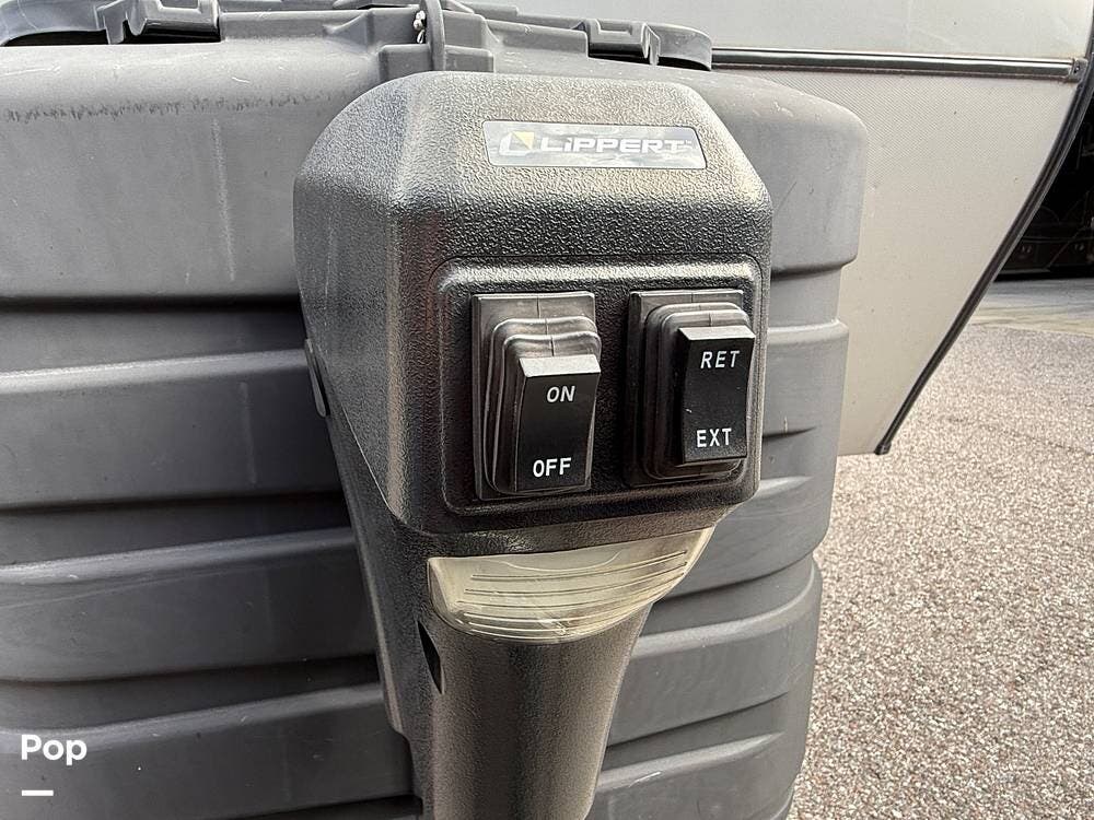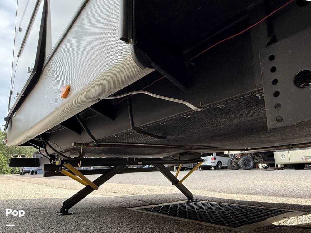 Outdoor living is made easy with a well-designed exterior that includes an outdoor kitchen with a mini-fridge and electric griddle, two power patio awnings (8' & 11"), and pass-thru storage. Other notable features include power jack stands, a 30,000 BTU ducted heating system, Solar Protect 220-watt panel, tankless water heater, and an Anderson weight distribution hitch with sway control, ensuring smooth towing and setup.