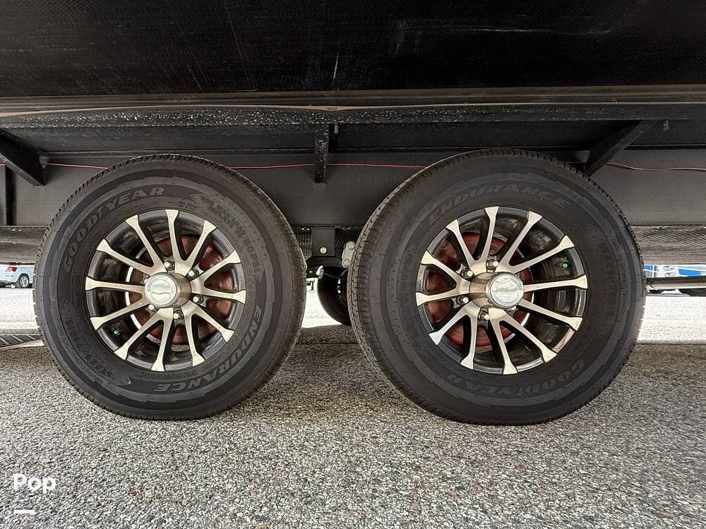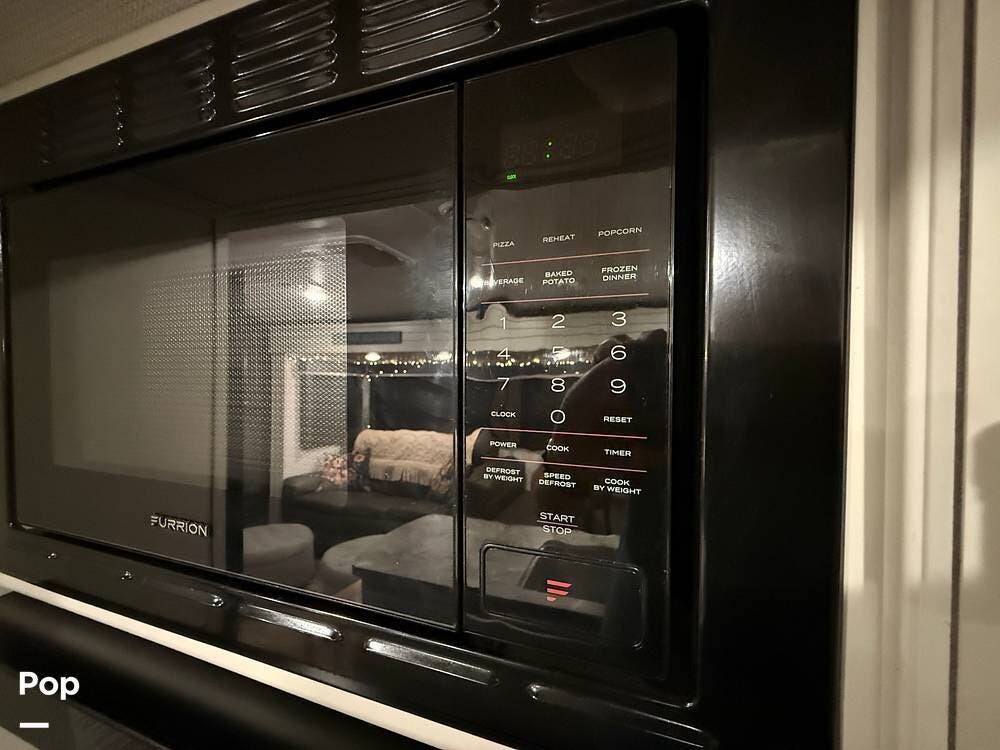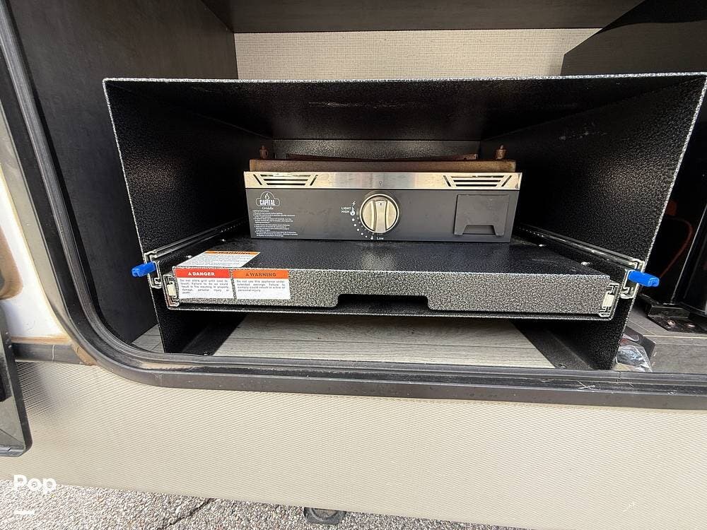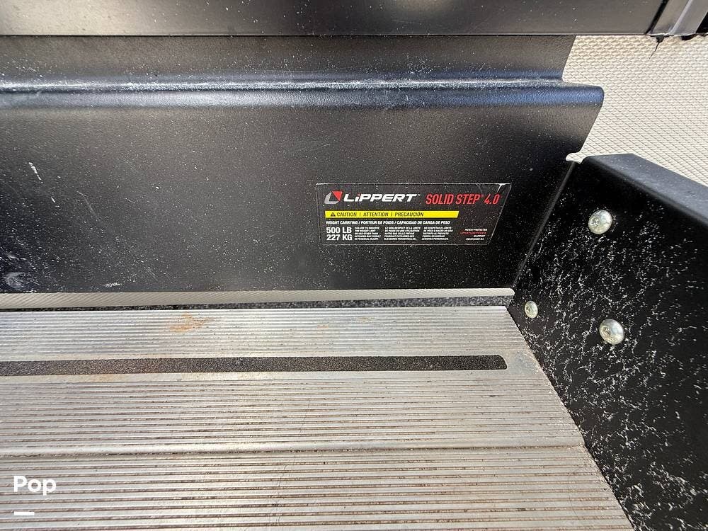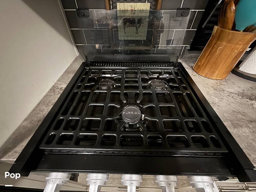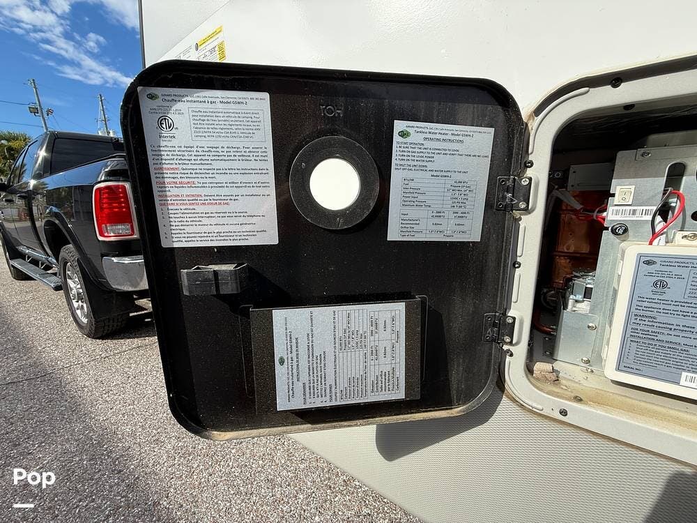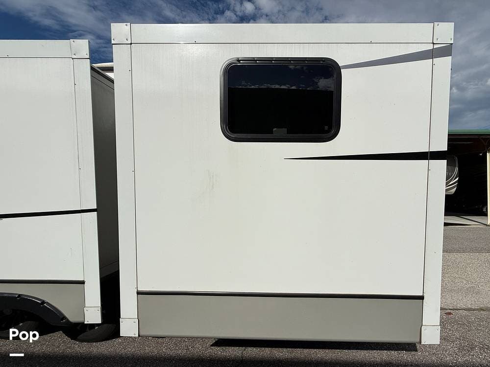 Outdoor living is made easy with a well-designed exterior that includes an outdoor kitchen with a mini-fridge and electric griddle, two power patio awnings (8' & 11"), and pass-thru storage. Other notable features include power jack stands, a 30,000 BTU ducted heating system, Solar Protect 220-watt panel, tankless water heater, and an Anderson weight distribution hitch with sway control, ensuring smooth towing and setup.