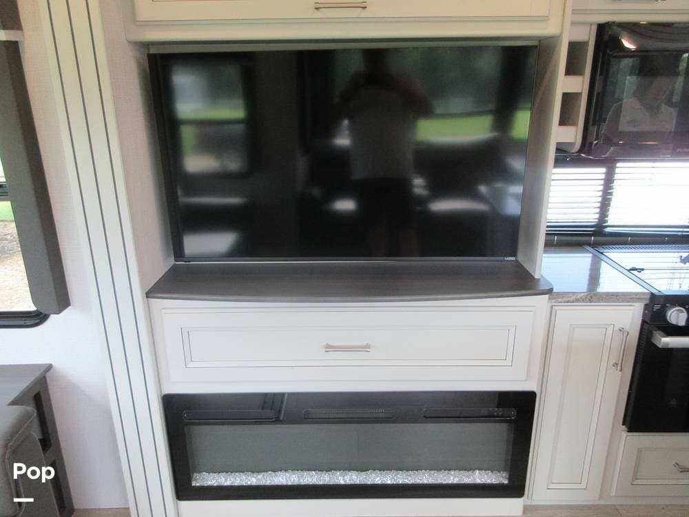 The open living area has two recliner theater seats facing the entertainment center, which has a large TV above a fireplace. There is also a sleeper sofa, and the dinette quickly converts into another sleeping area if needed.