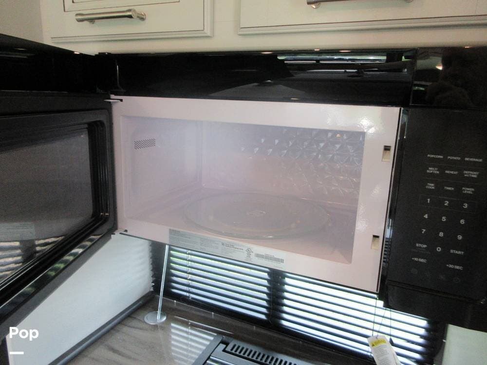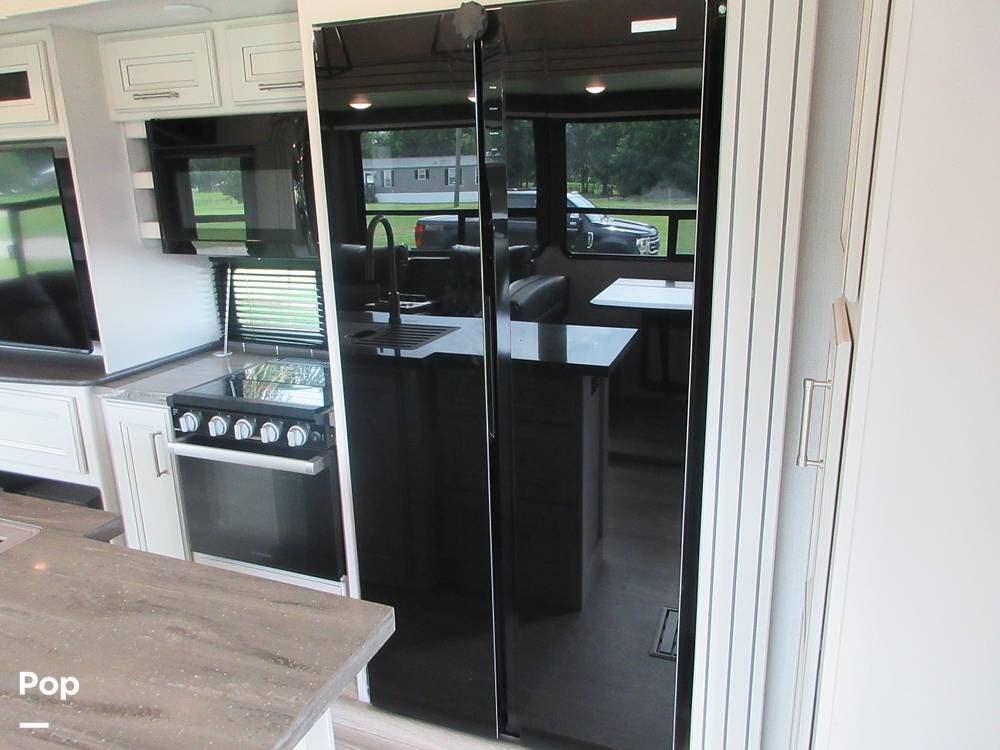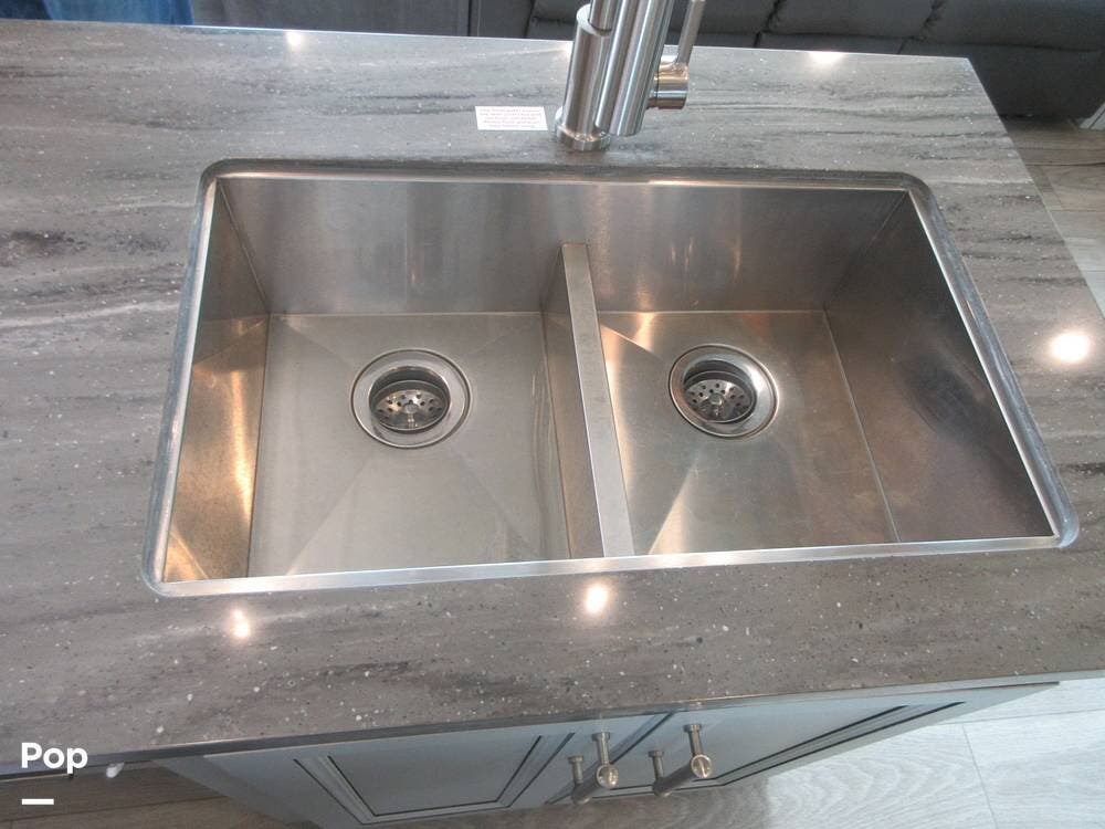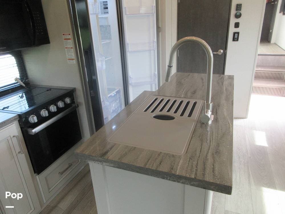 The galley features a large kitchen island and a stainless steel double sink with a cover and solid-surface countertops. The residential refrigerator, a microwave, a stove, and an oven make meal prep fun and easy with lots of room to operate. The full floor-to-ceiling pantry closet and cabinets above and below the countertops provide ample storage space.