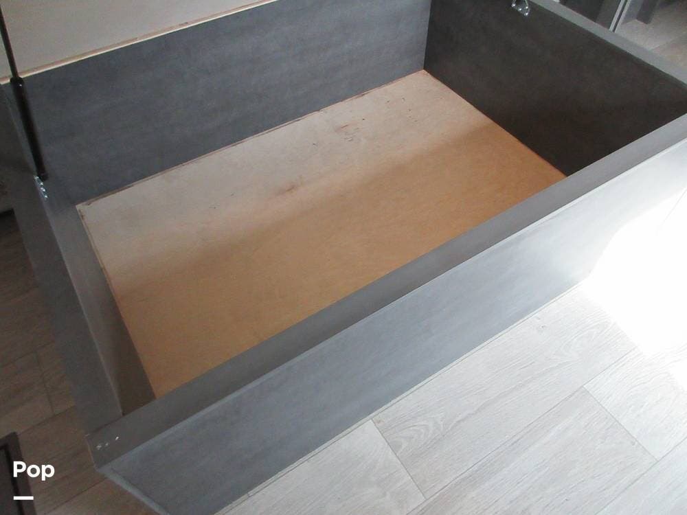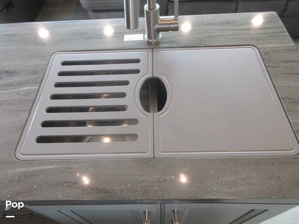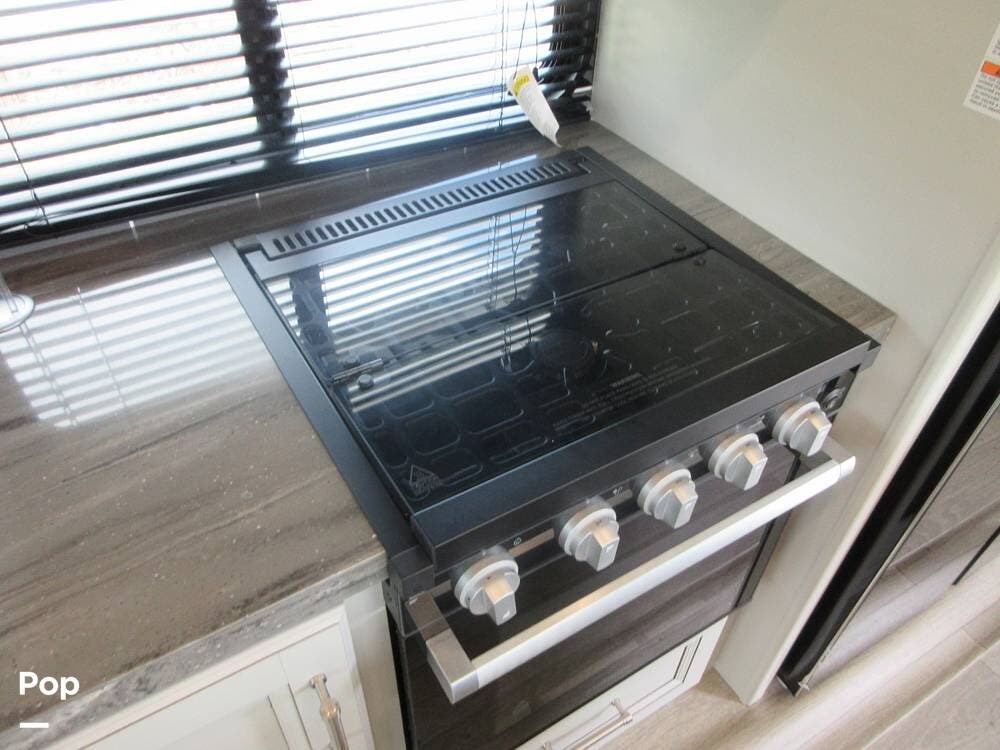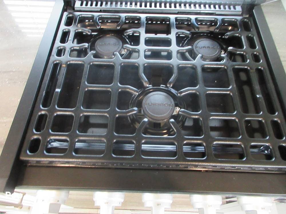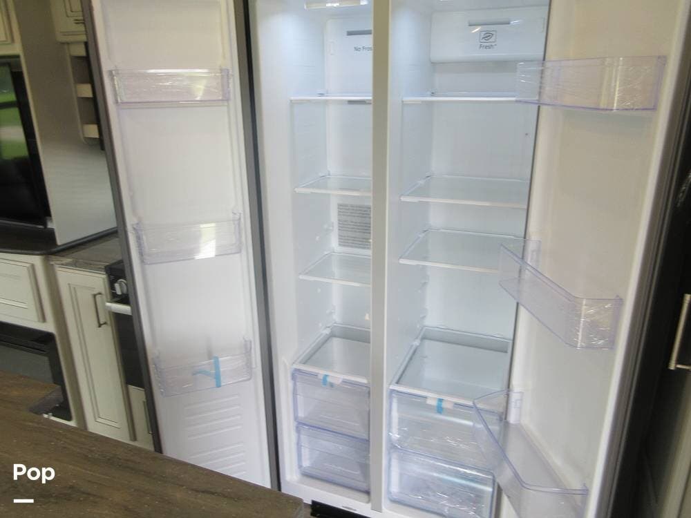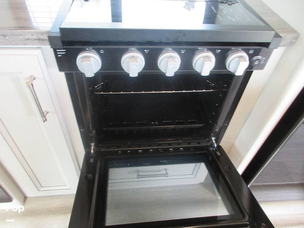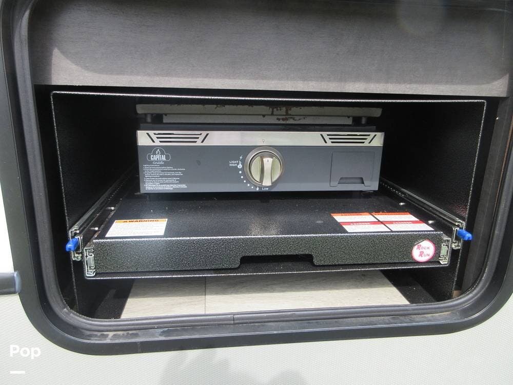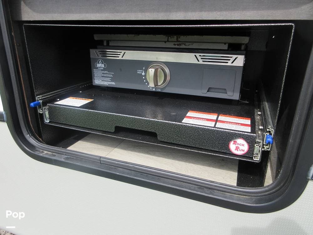 Outside, the two powered patio awnings make this an excellent unit for tailgating or extending the fun outdoors at your favorite campsite. The Capital Griddle Grill is on a slide-out tray that allows you to cook outdoors, and there is a large, full-width storage bay with access from both sides of the RV.